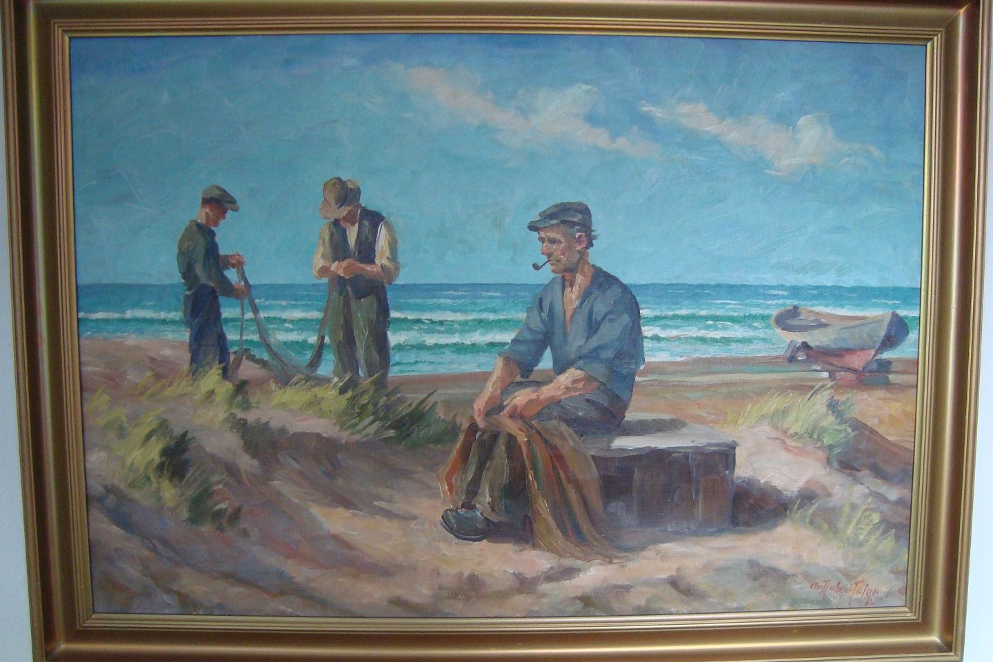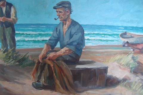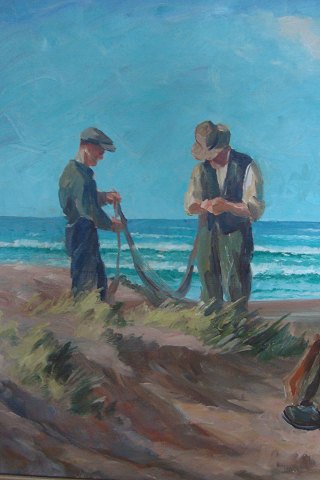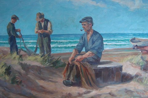 Text available in Danish: Maleri af Christian Aabye-Talge - Fiskere rengør garn på stranden.