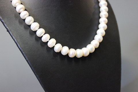 Halskæde med semi runde ferskvandsperler med hvidt slør og forgyldt lås.
