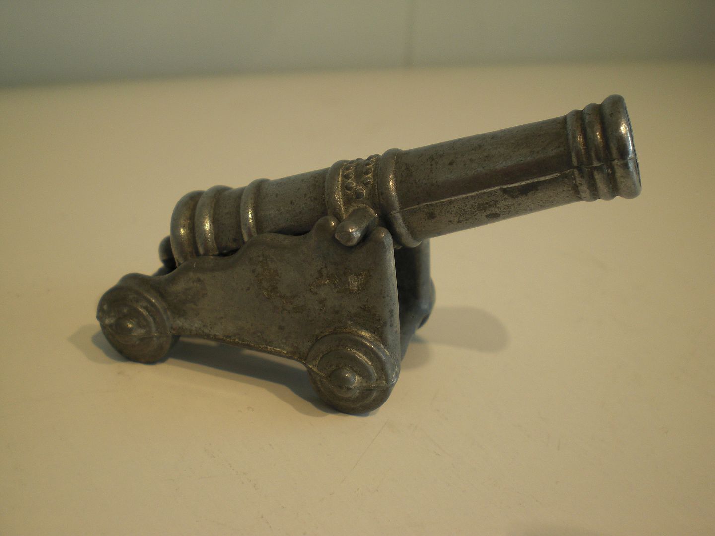 Lille bord/dekorationskanon i støbt tin. Firhjulet (faste) signalkanon. 20 årh. Længde kanonrør: 6,5 cm. Samlet længde på tinvogn: 7 cm. Samlet højde på jernvogn: 4,5 cm.