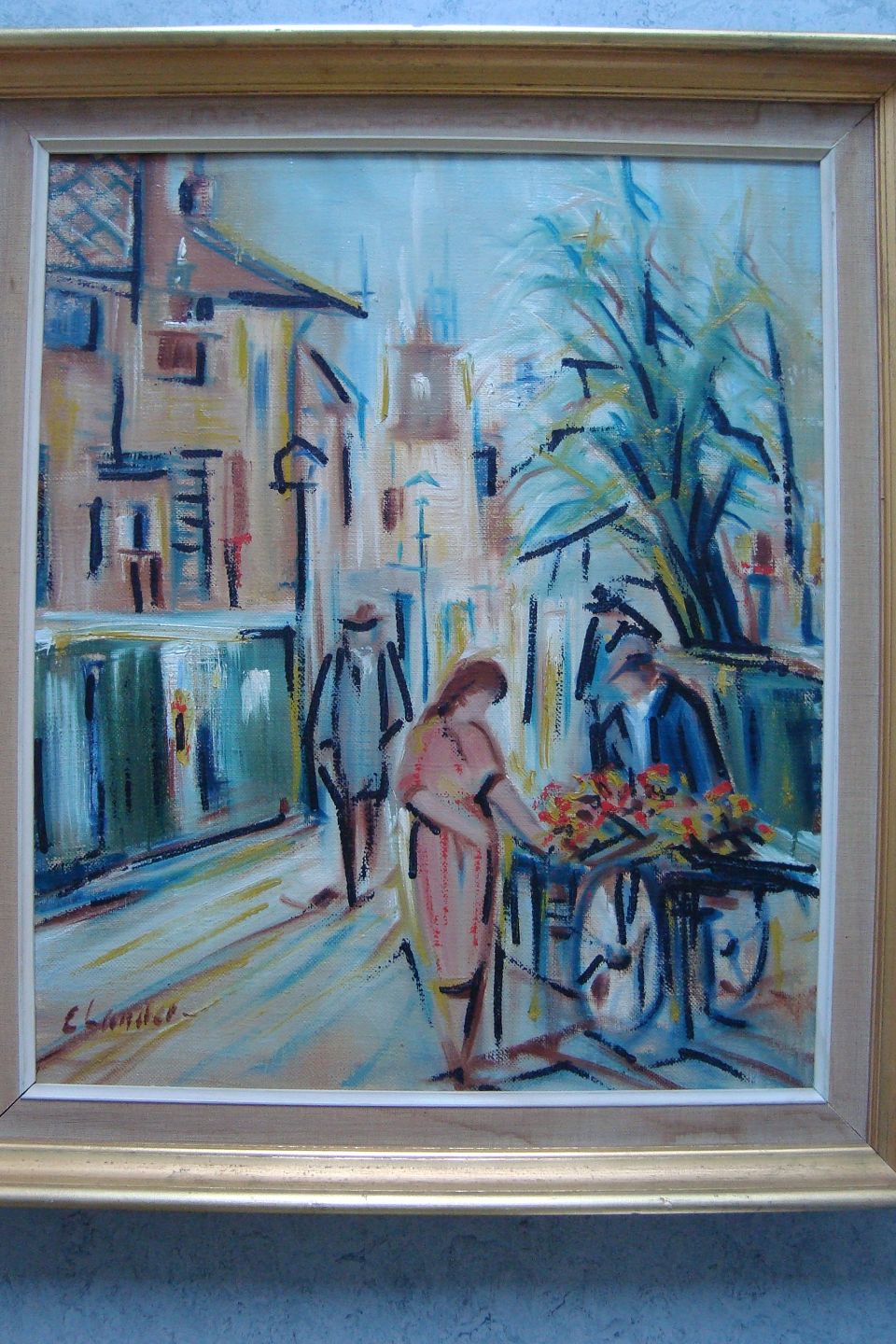 Maleri - bymotiv med gadehandler og kunder af Carl Lander.