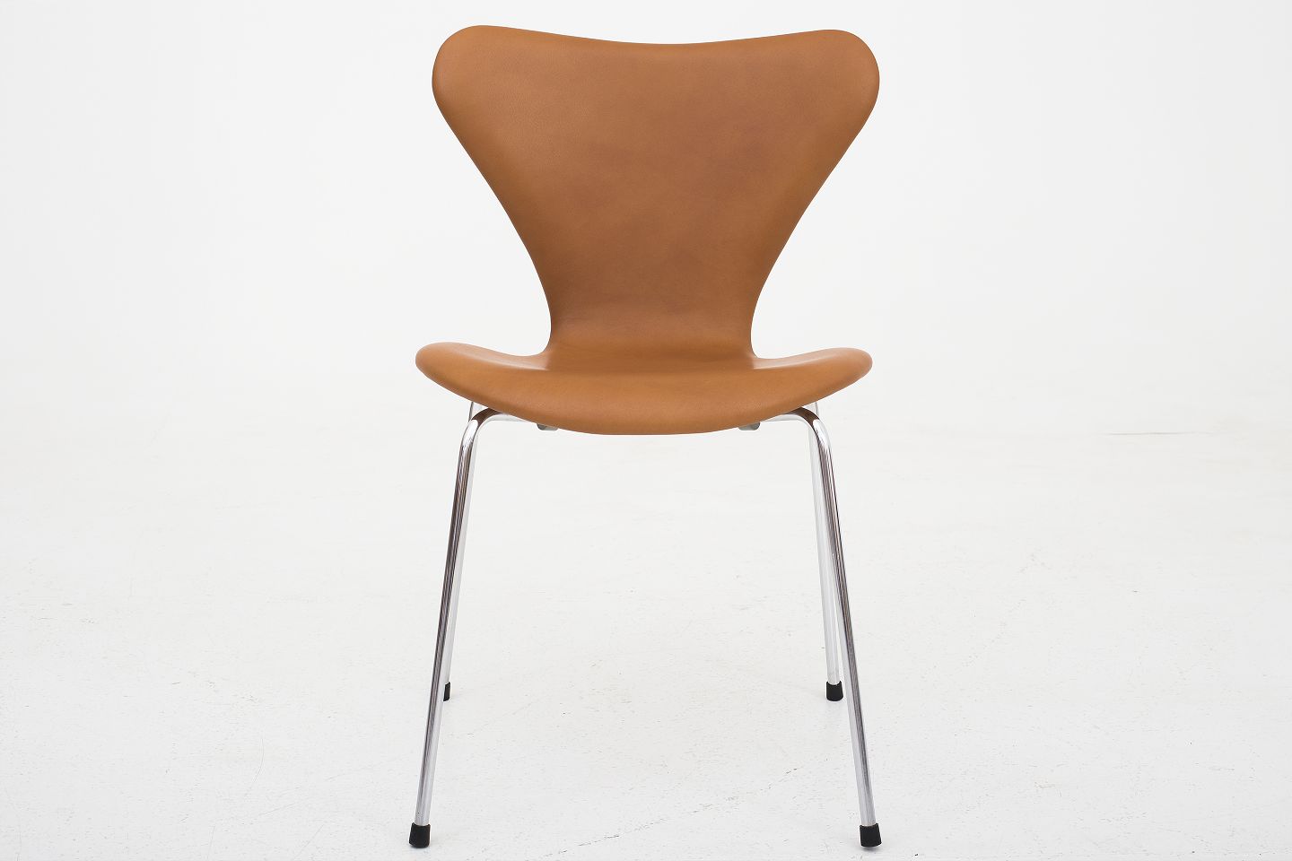 AJ 3107 - "Syver"-stol i nybetrukket KLASSIK Cognac-læder. Vi tilbyder ompolstring af AJ 3107, betrukket med stof eller læder efter eget valg. Kontakt os for mere information.