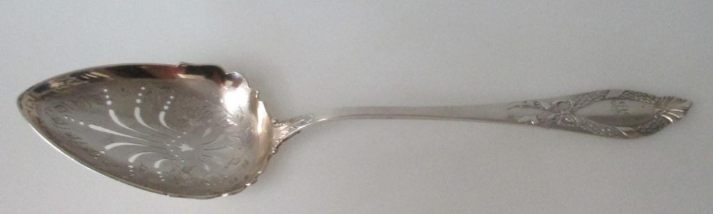 Jordbær ske i sølv, med dekorationer. Lauritz Nielsen Saaby, Ringsted, Danmark, 1909. Dekorationer med blomster og ranker. Stemplet.: N. Saaby. L.: 28 cm. Med forgyldning. Med indgravering. Vægt.: 90 gram.