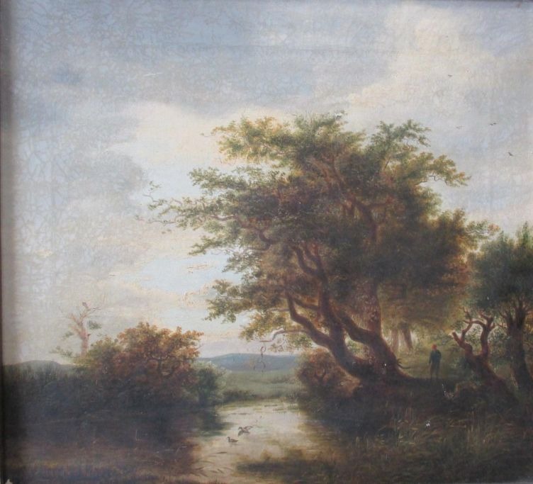 Dansk kunstner (19. årh.): Landskab.  Kopi efter Jacob van Ruisdal (ca. 1628 - 1682). Originalen findes på Statens Museum for Kunst, København. Gammelt inventarnummer: 301. "Egetræerved Kæret - Paa Brinken t.h. for det lille Kær staar en Fisker ved nogle store Ege....."Købt fra Wahls samling i 1744.  35 x 37,5 cm. På blændrammen anført, at værket er malet af Mary Ogilvie. Proveniens: Familien Mønsted, Aarhus. I bobinet ramme.