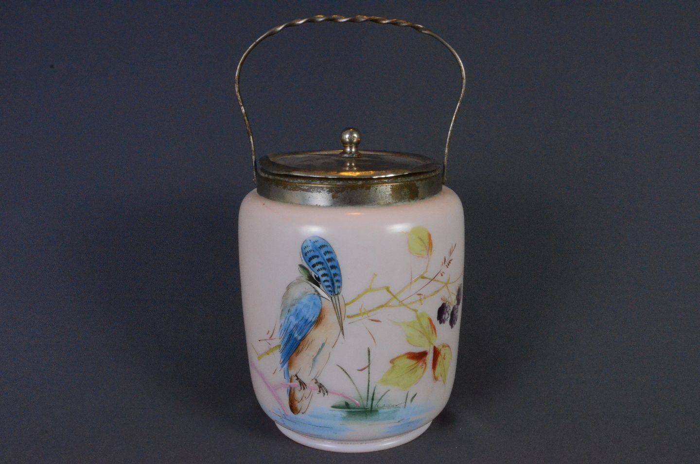 Kiksespand, Glas med håndmalet motiv, Fyens Glasværk?, h: 25 cm