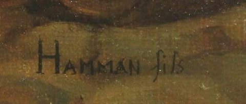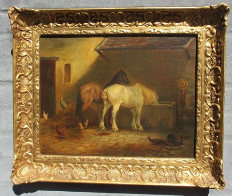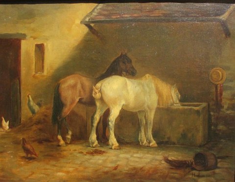 Hamman, Edouard Michel Ferdinand (1850 - ) Frankrig: Heste ved vandtruget. Olie på lærred. Signeret.: Hamman fils. 32 x 41 cm.