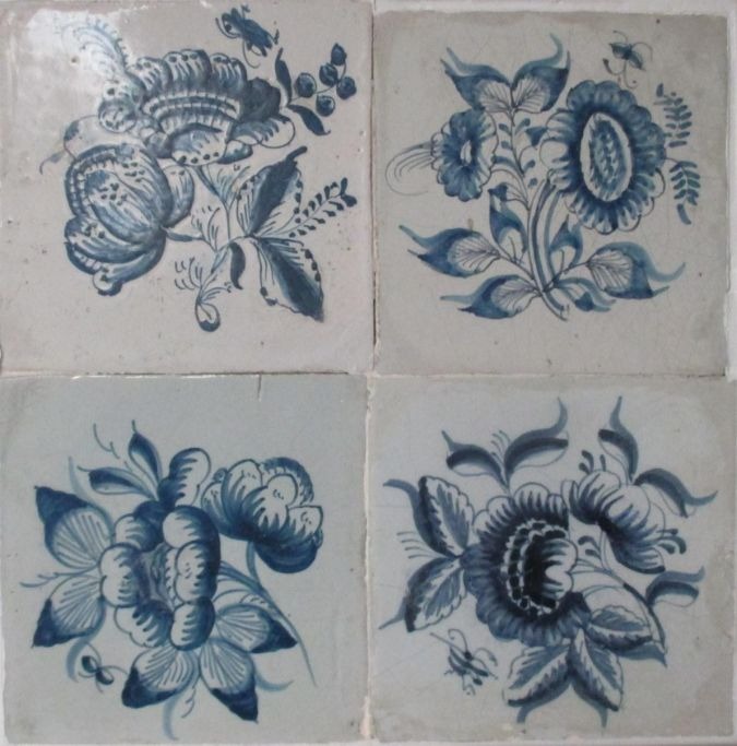 Firpas med Hollandske fliser, blåmalet, med blomster, 1700-tallet. 25,5 x 25,5 cm.