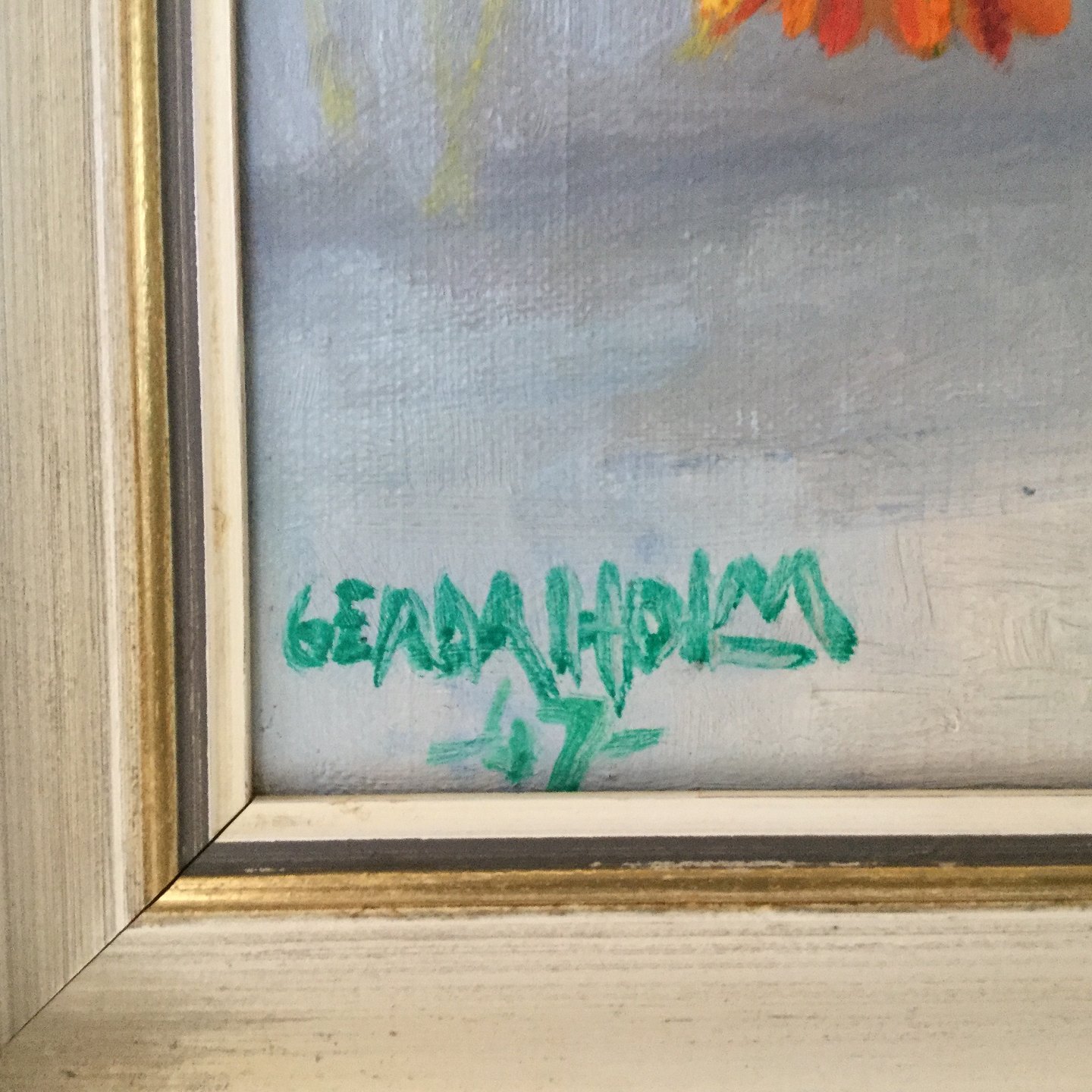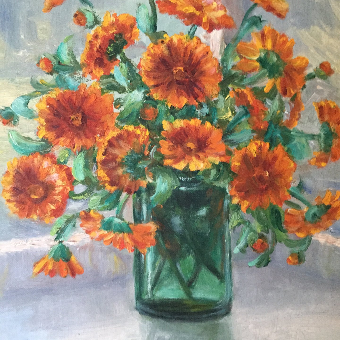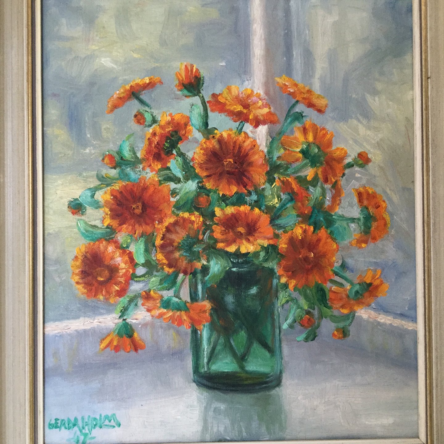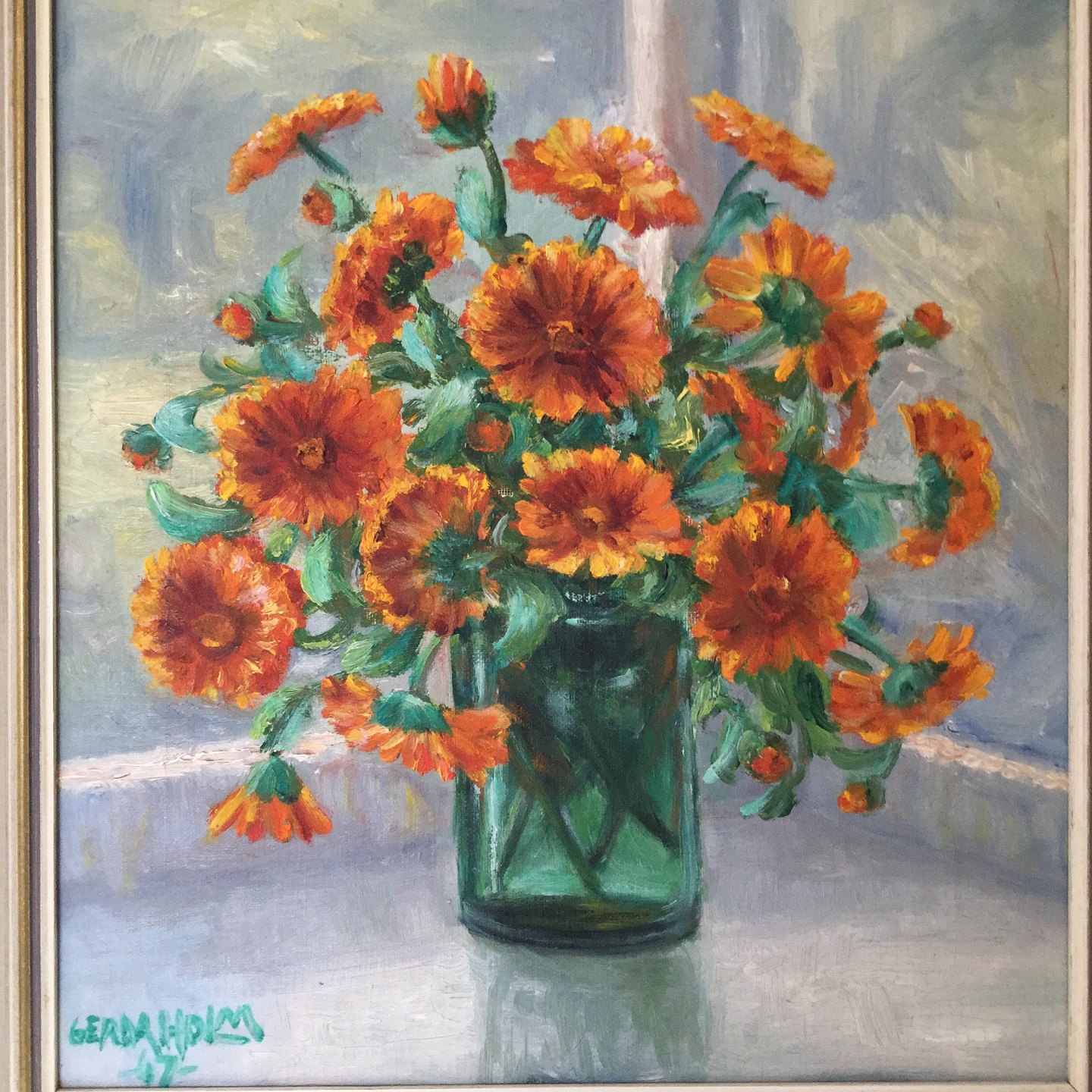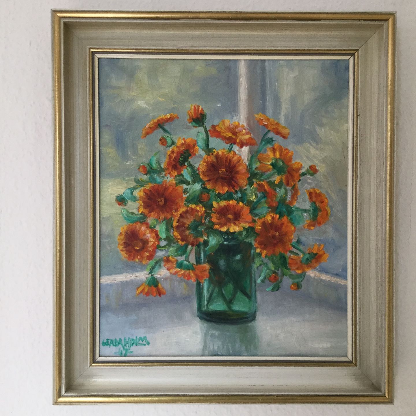 Maleri af Gerda Holm - Morgenfruer i grøn glasvase.
