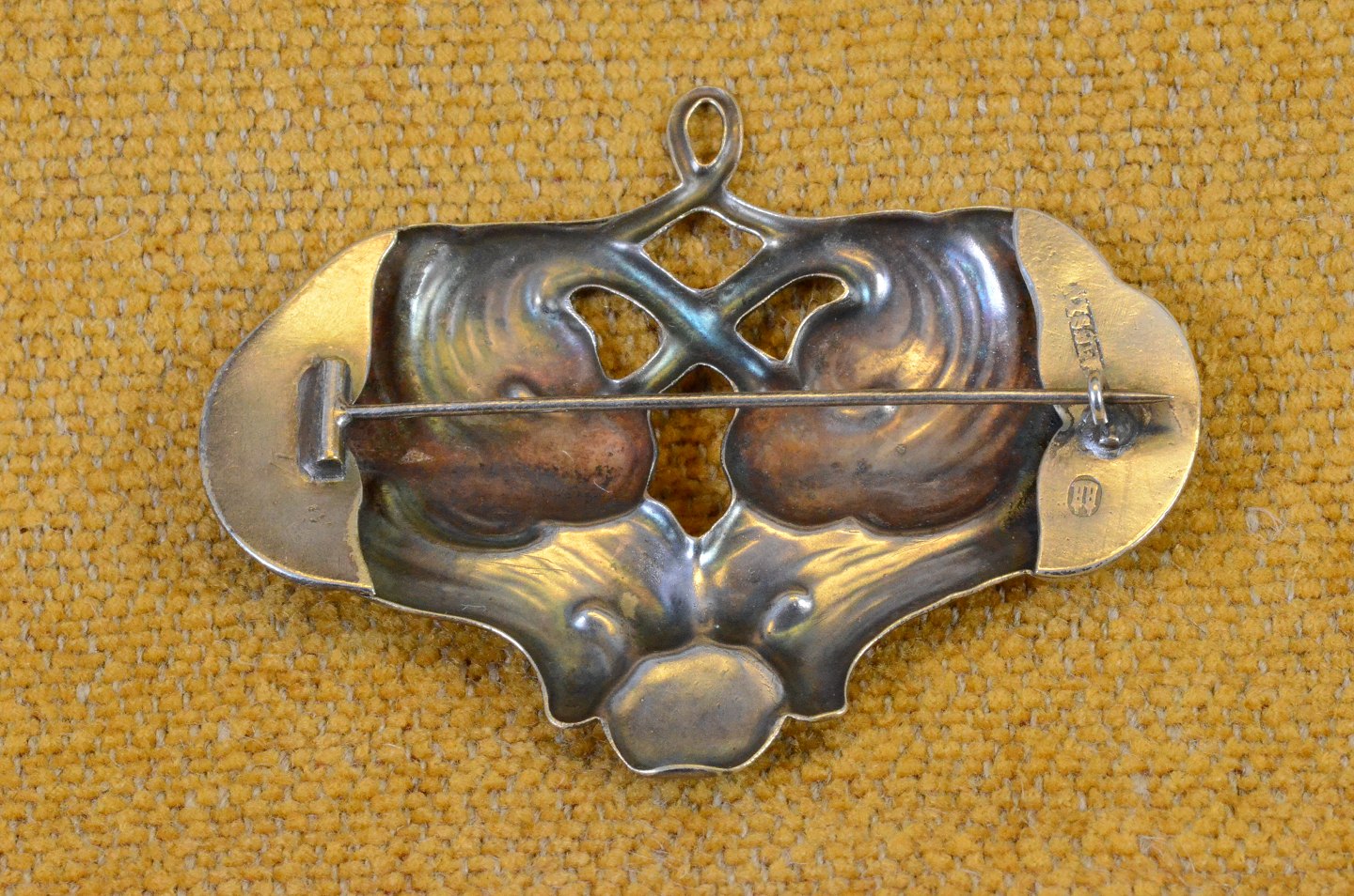 Broche skønvirke i organisk mønster med perle af rav. Stemplet 2tårne.