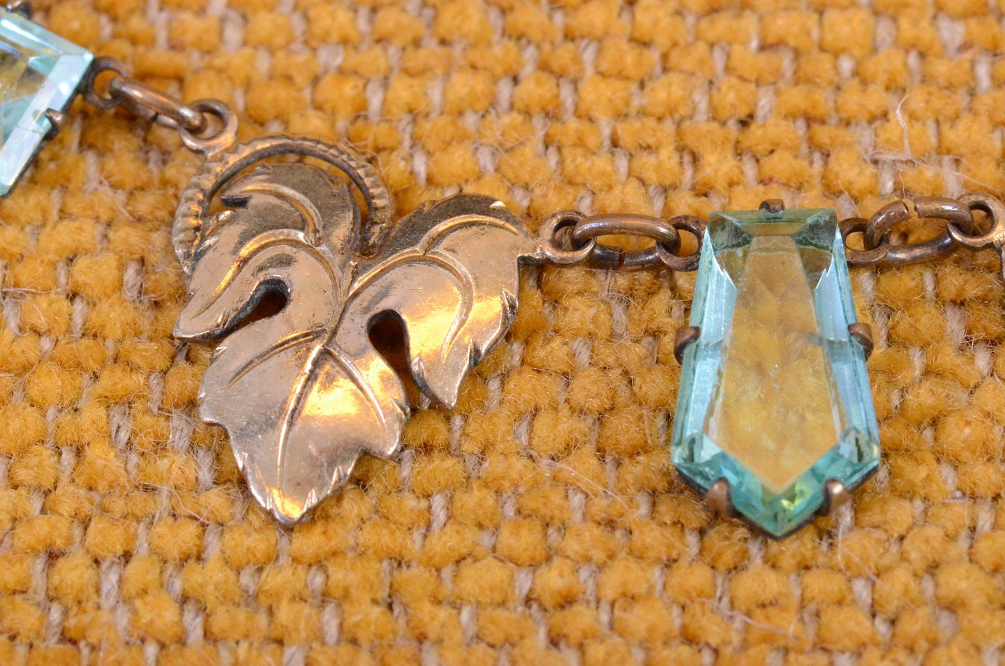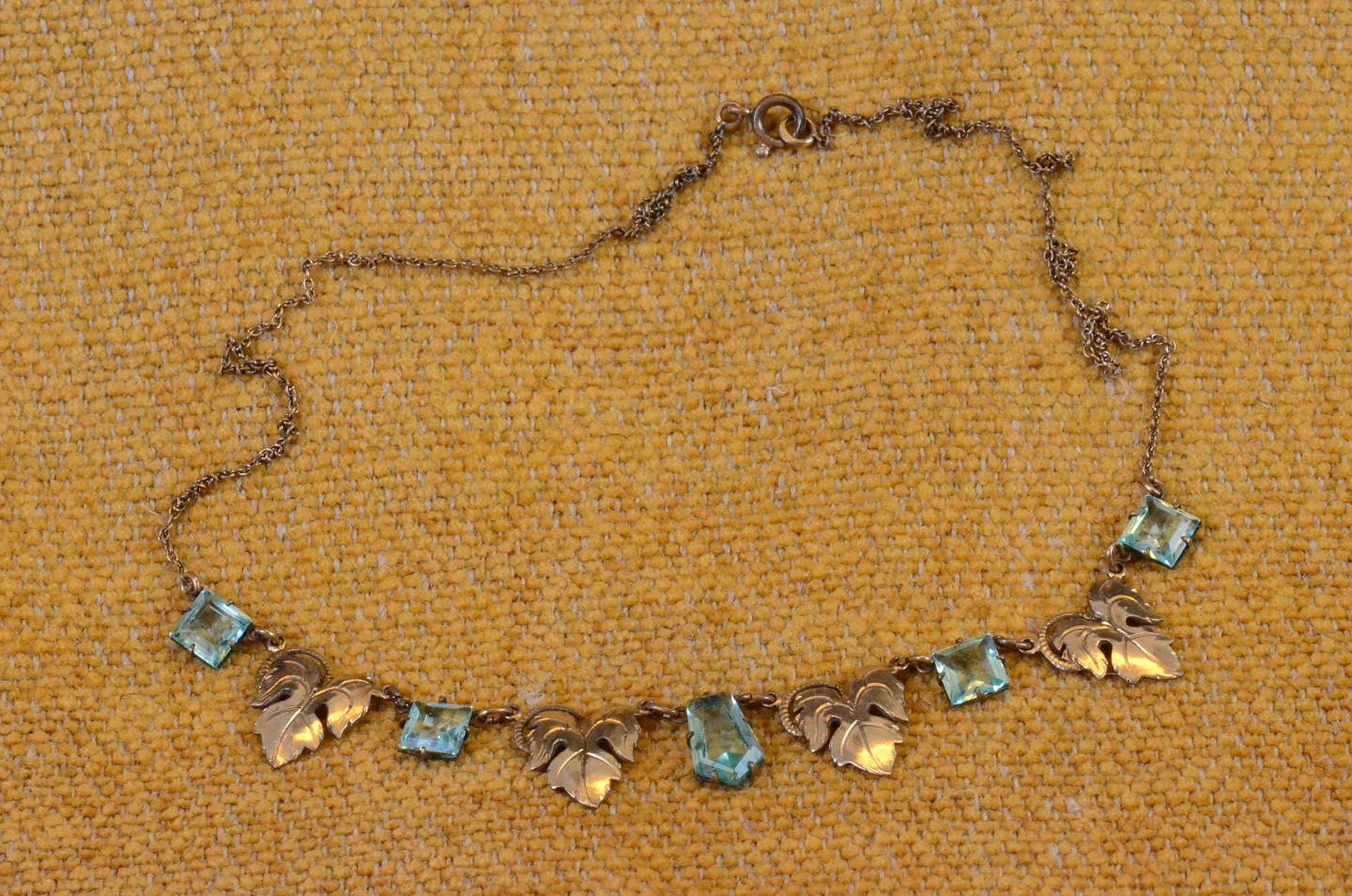 Collier forgyldt prydet med blade og imiteret aquamarin sten. Str.: 48 cm