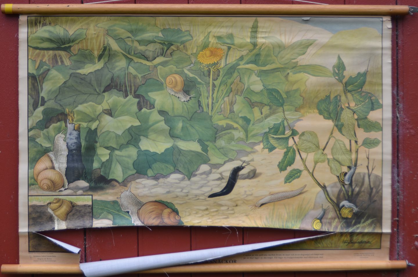 Anskuelsestavle med træstokke: Snegle, Billedmål: 66 x 98 cm, OBS: Kortet er revnet, og skal limes! (anskuelsestavle nr. 17)