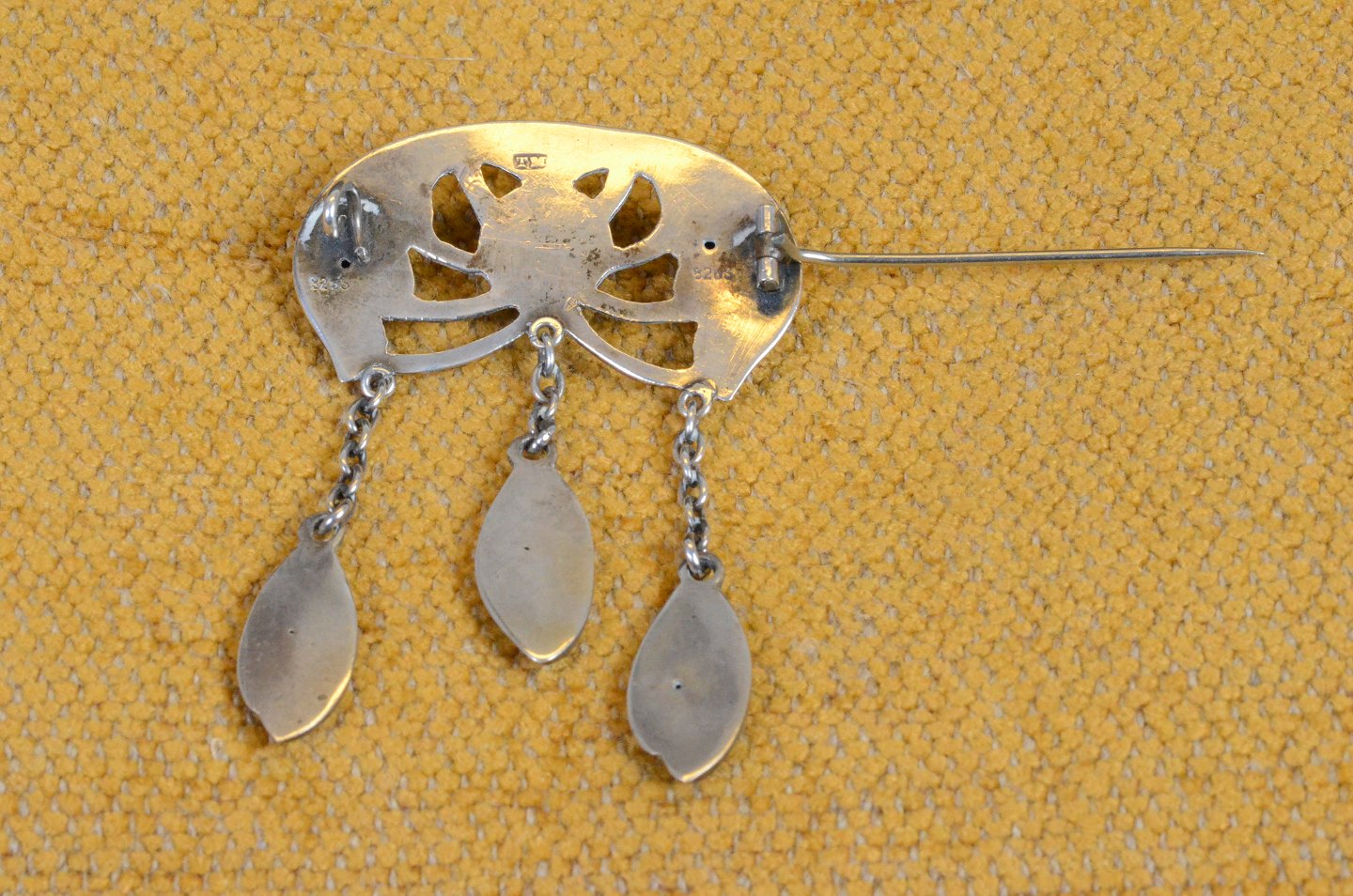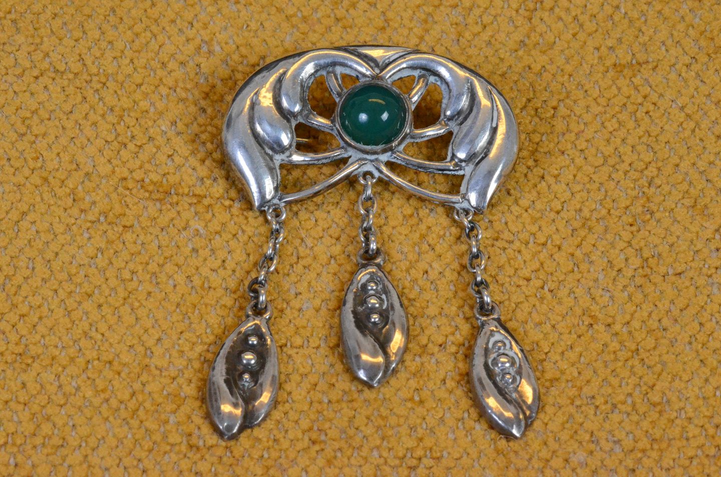 Broche skønvirke, Jugend, Art Nouveau af organisk mønster i sølv med lukket bagside. Dekoreret med cabochonslebne grøn agat i centrum af broche og på de 3 vedhæng. Stemplet 826S "TM". Art No. 35