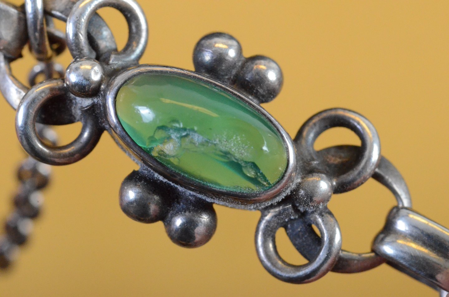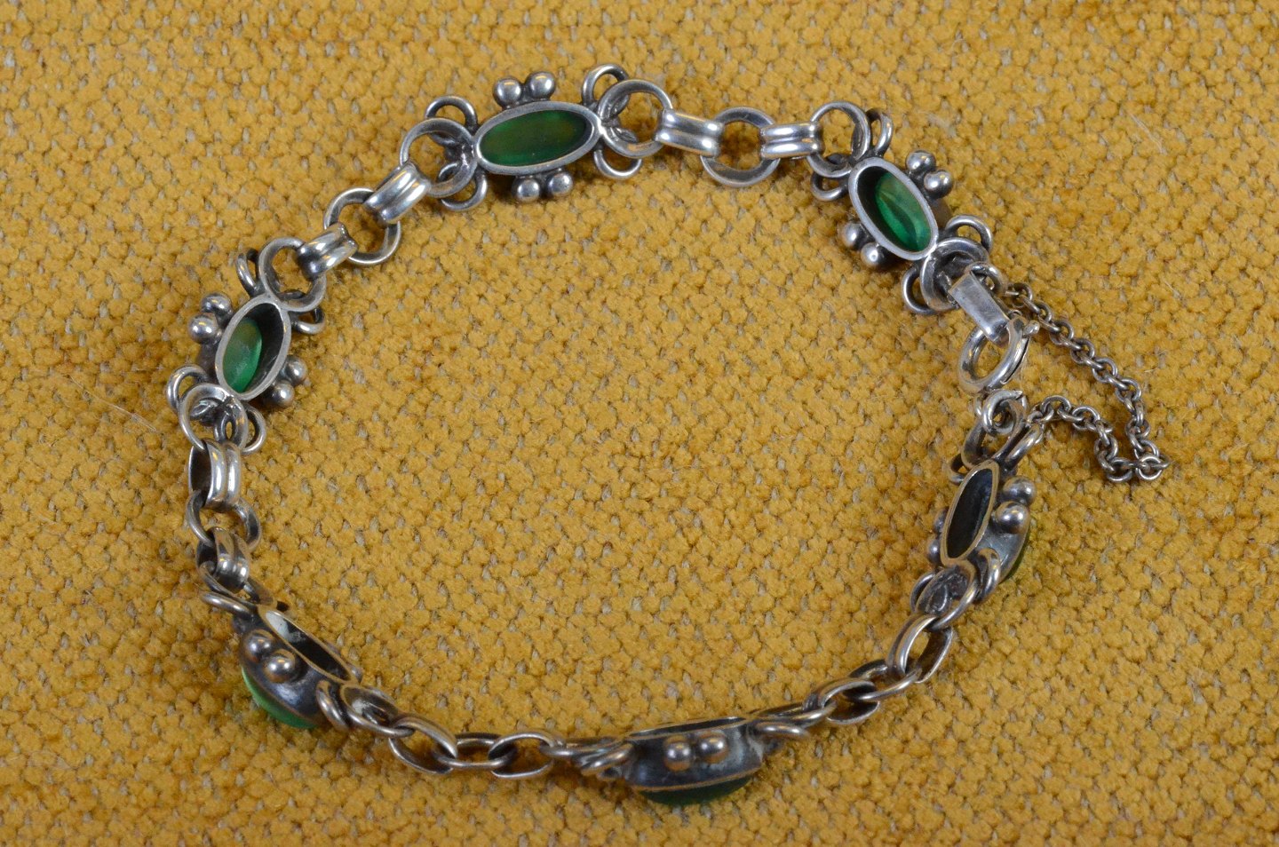 Armbånd skønvirke i sølv dekoreret med grøn flusser. Str.: 17 cm. Art No. 40