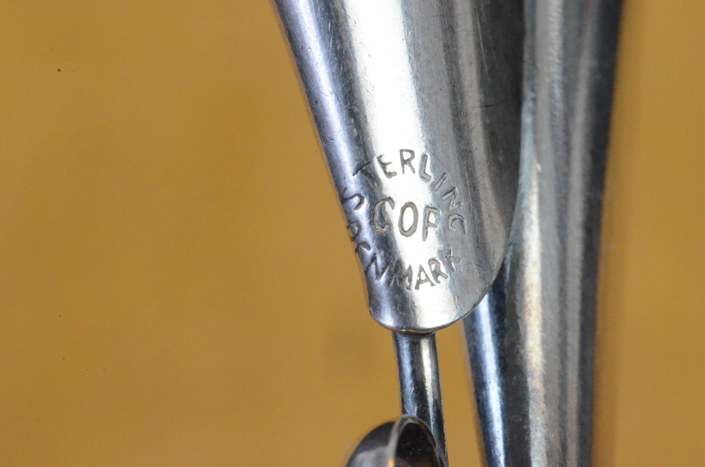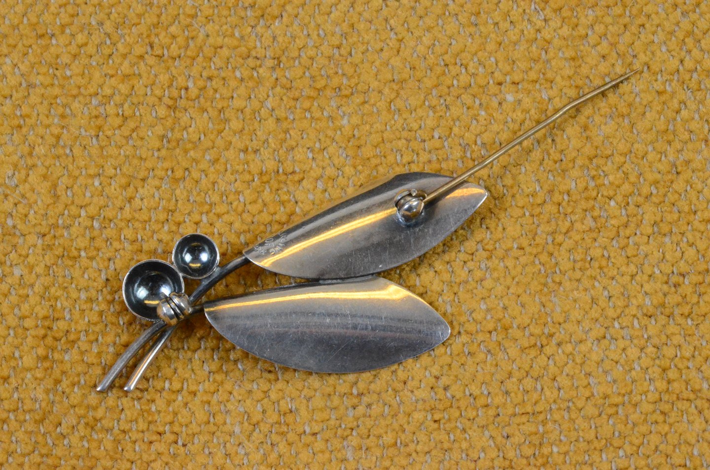 Broche af sølv udformet som lille kvist med 2 knopper og 2 buet blade. Stemplet Sterling COF Denmark. Carl Ove Frydensberg – Copenhagen 1949 – 1982. Str.: 6,5*2,3 cm. Art No. 73
