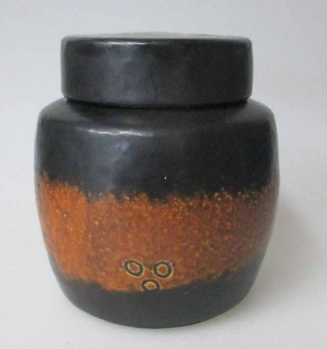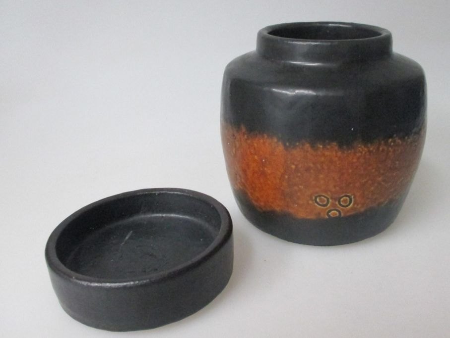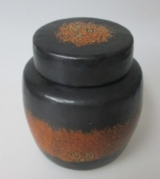 Nymølle lågkrukke i stentøj, Axel Brüel (1903-1977), Danmark. I brunt og sort med dekorationer. Højde: 11 cm.