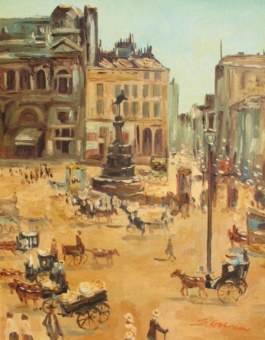 Ubekendt kunstner (20. årh.): Parti fra en storby med hestevogne. Olie på lærred. Signeret: S. Crolman. 50 x 40 cm.