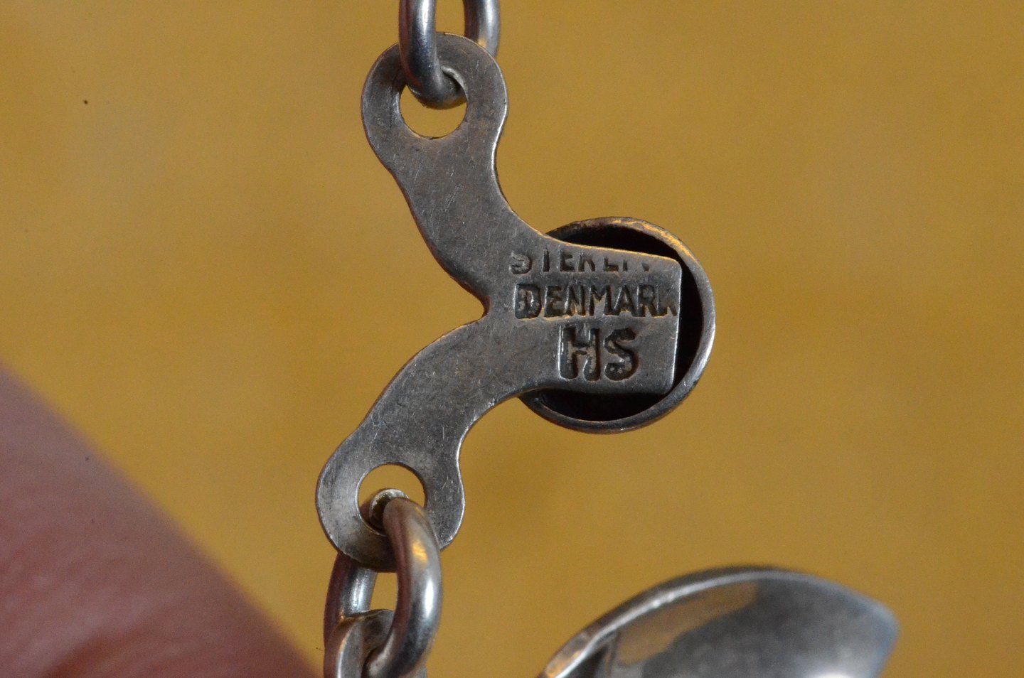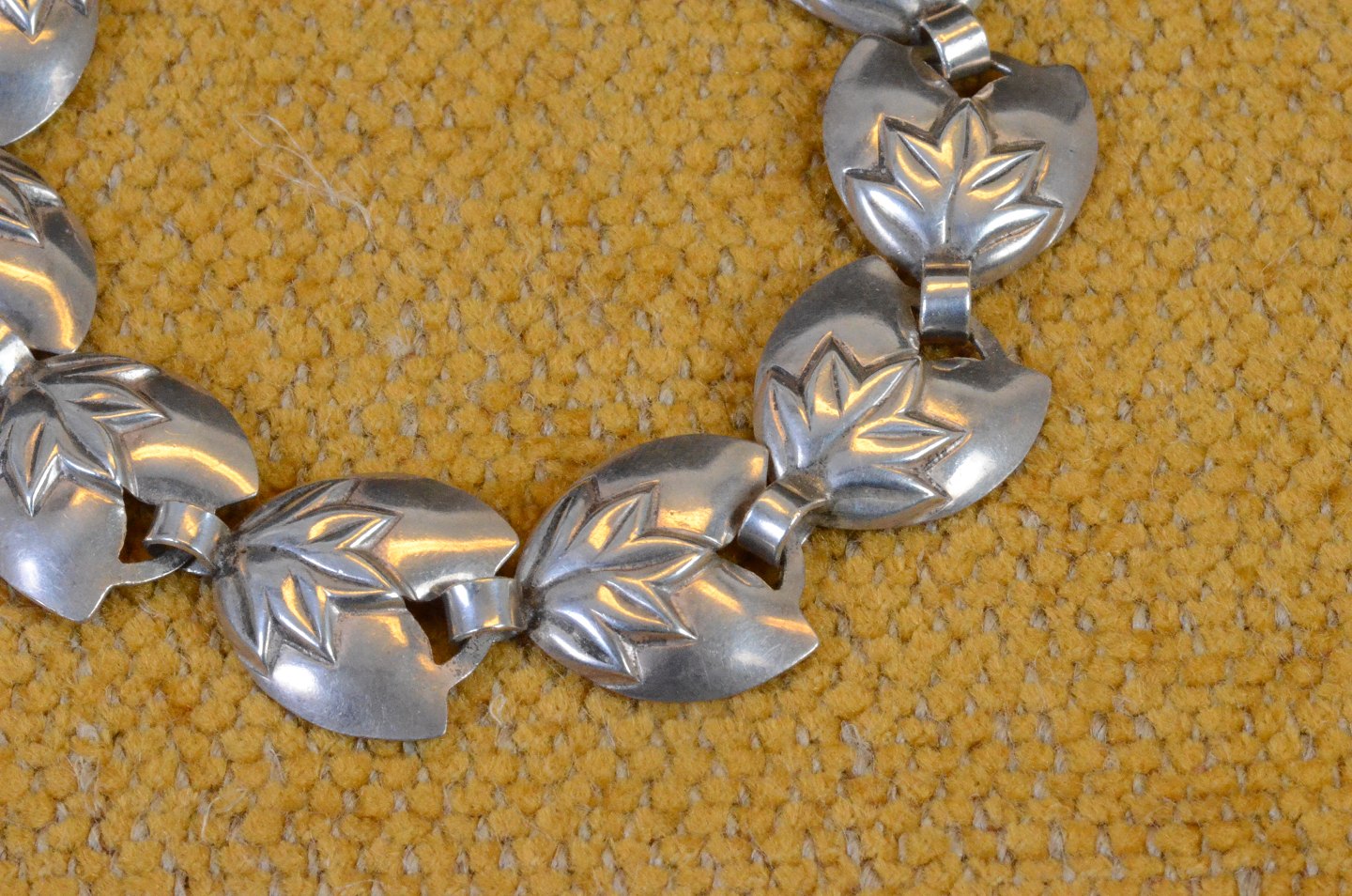 Sølv collier og armbånd. Collier med dekoration i form af blade og kæde. Armbånd leddelt med samme dekoration. Stemplet 925 HS. Hermann Siersbøl. Str.: collier 40 cm, armbånd 17 cm. Art No. 80