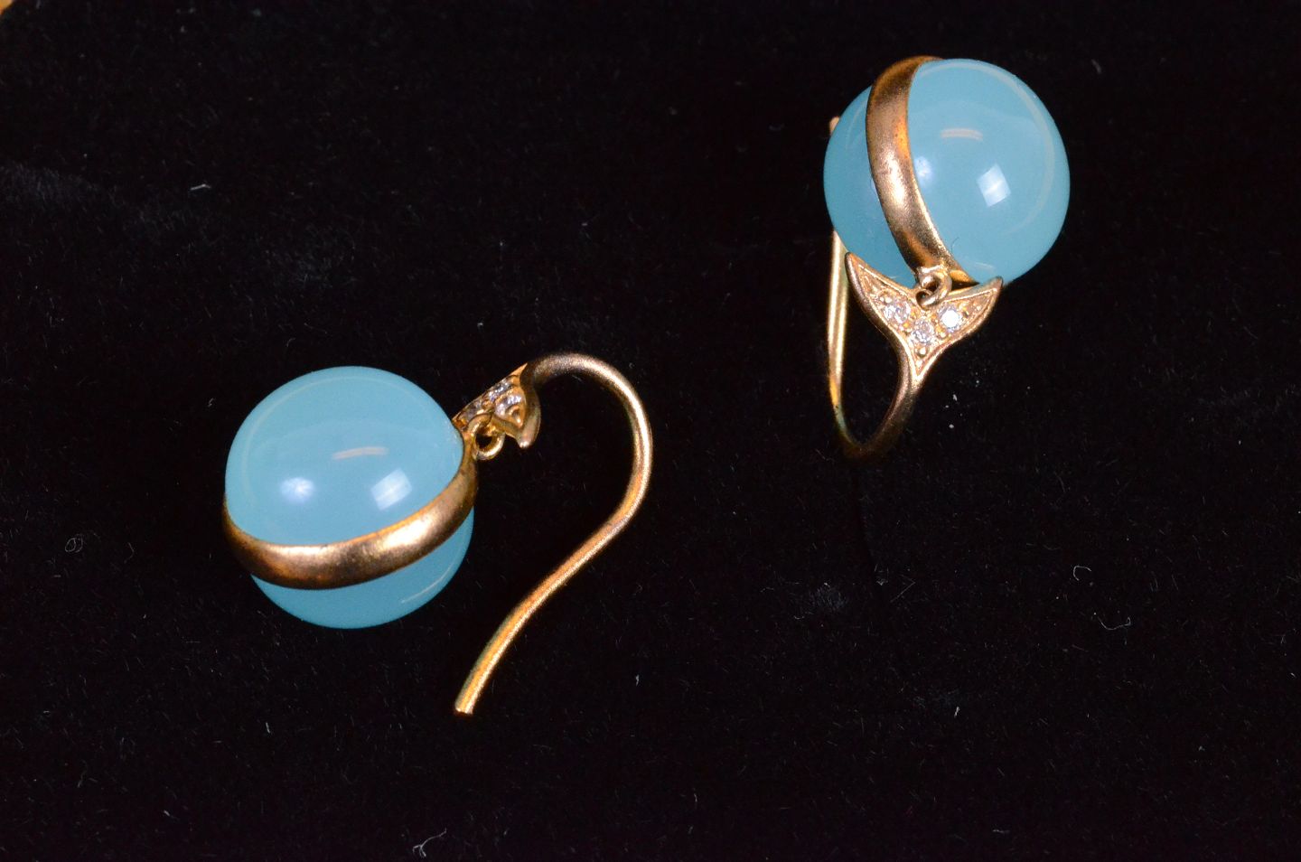 Øreringe med bøjle og fatning i forgyldt sølv med isblå og klare sten. Stemplet 825 JS. Str.: l 1,8 cm Art.No. 108