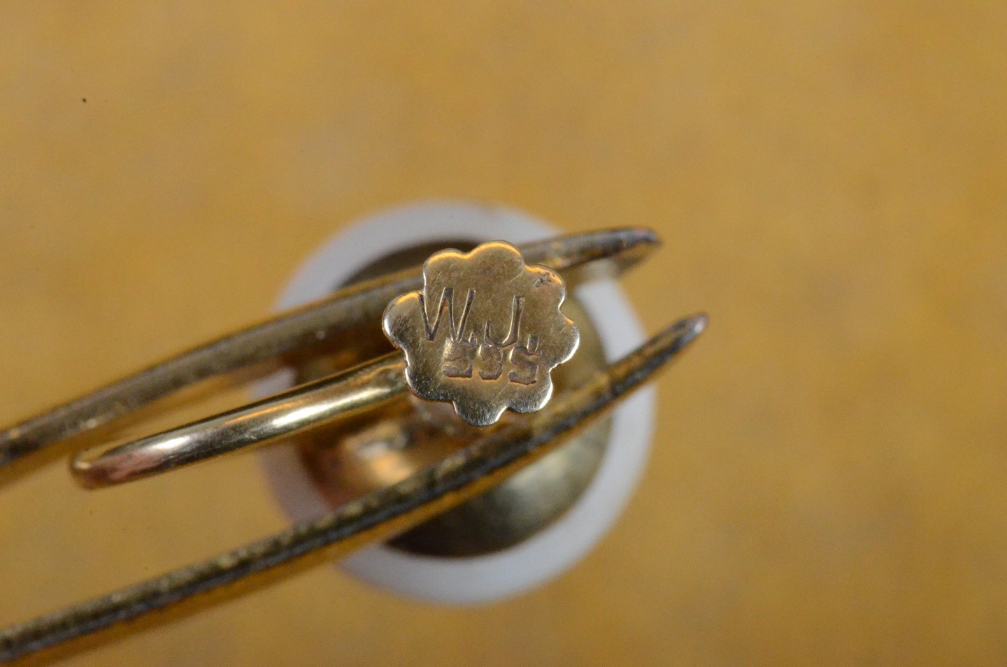 Øreringe i guld og hvid koral, lukket med skruelås. Stemplet 585 JW, har små rosa pletter. Størrelse: diameter 1 cm. Art nr 111