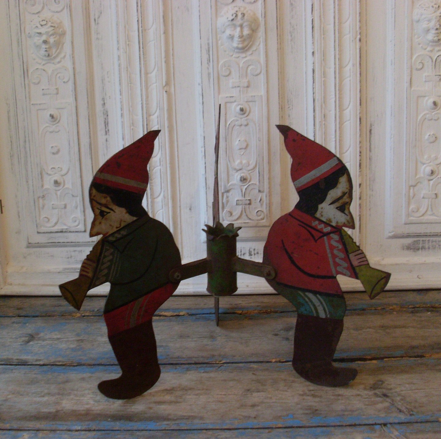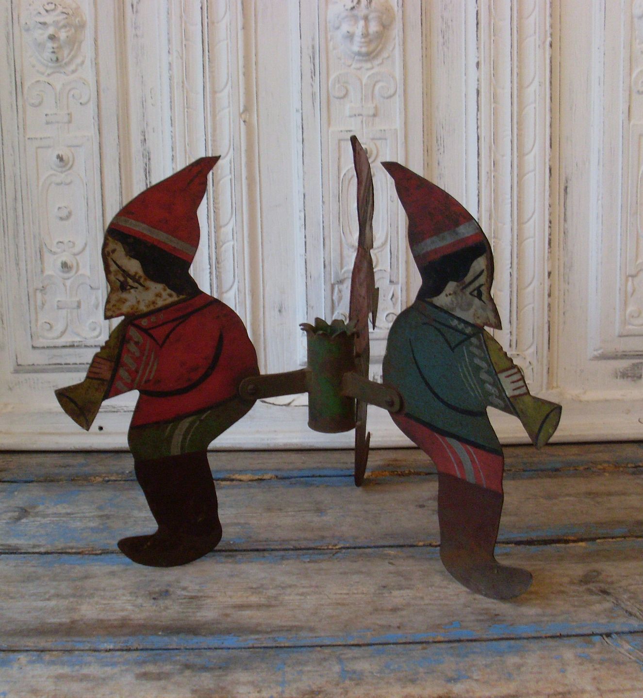 Gammel juletræsfod i bemalet jern i form af nisser der spiller trompet.