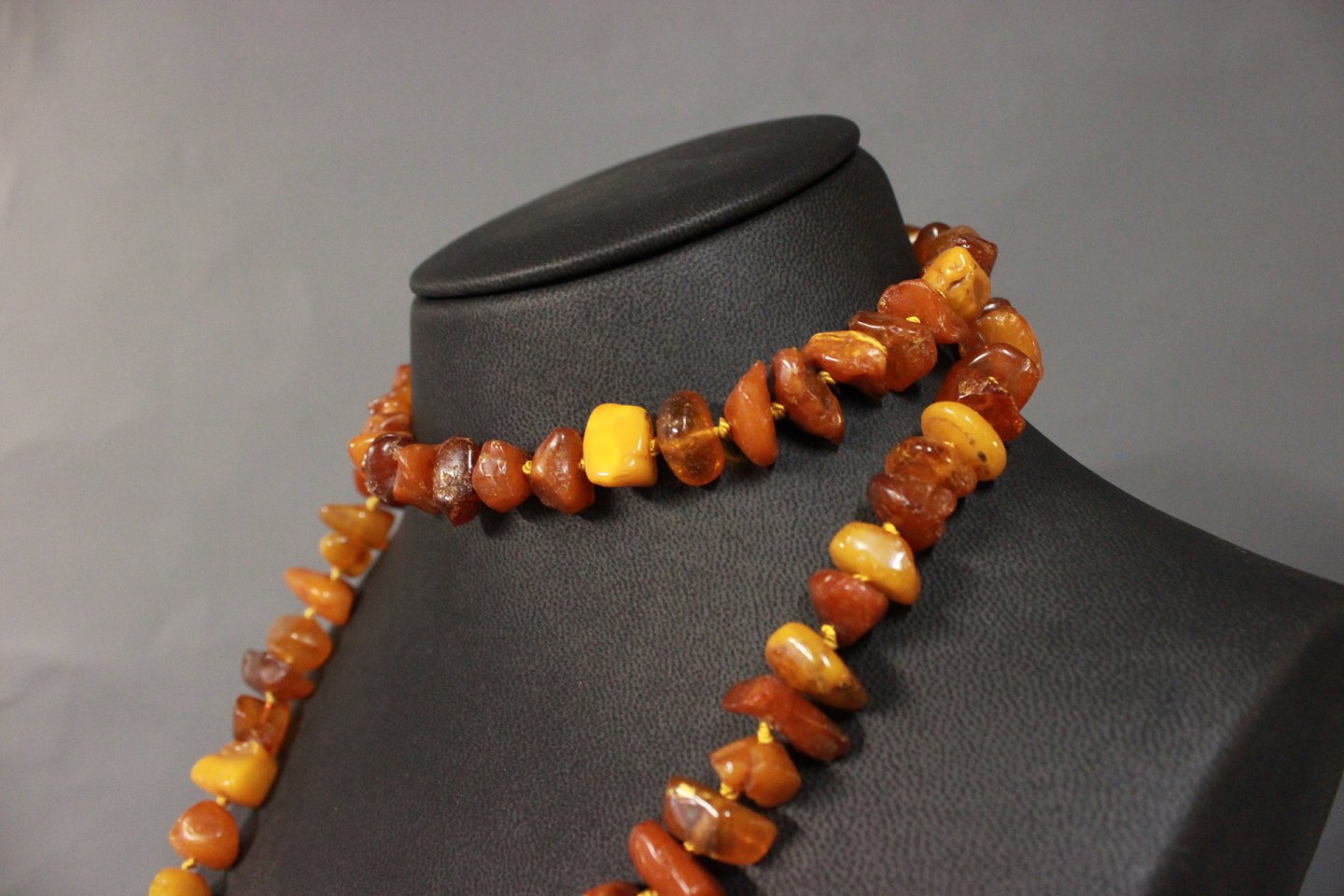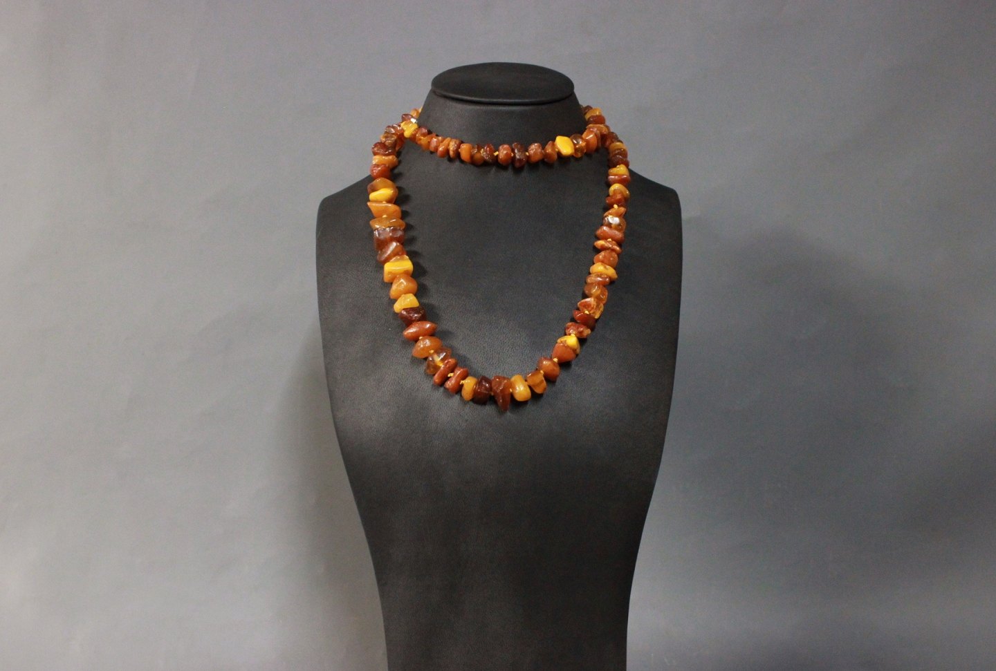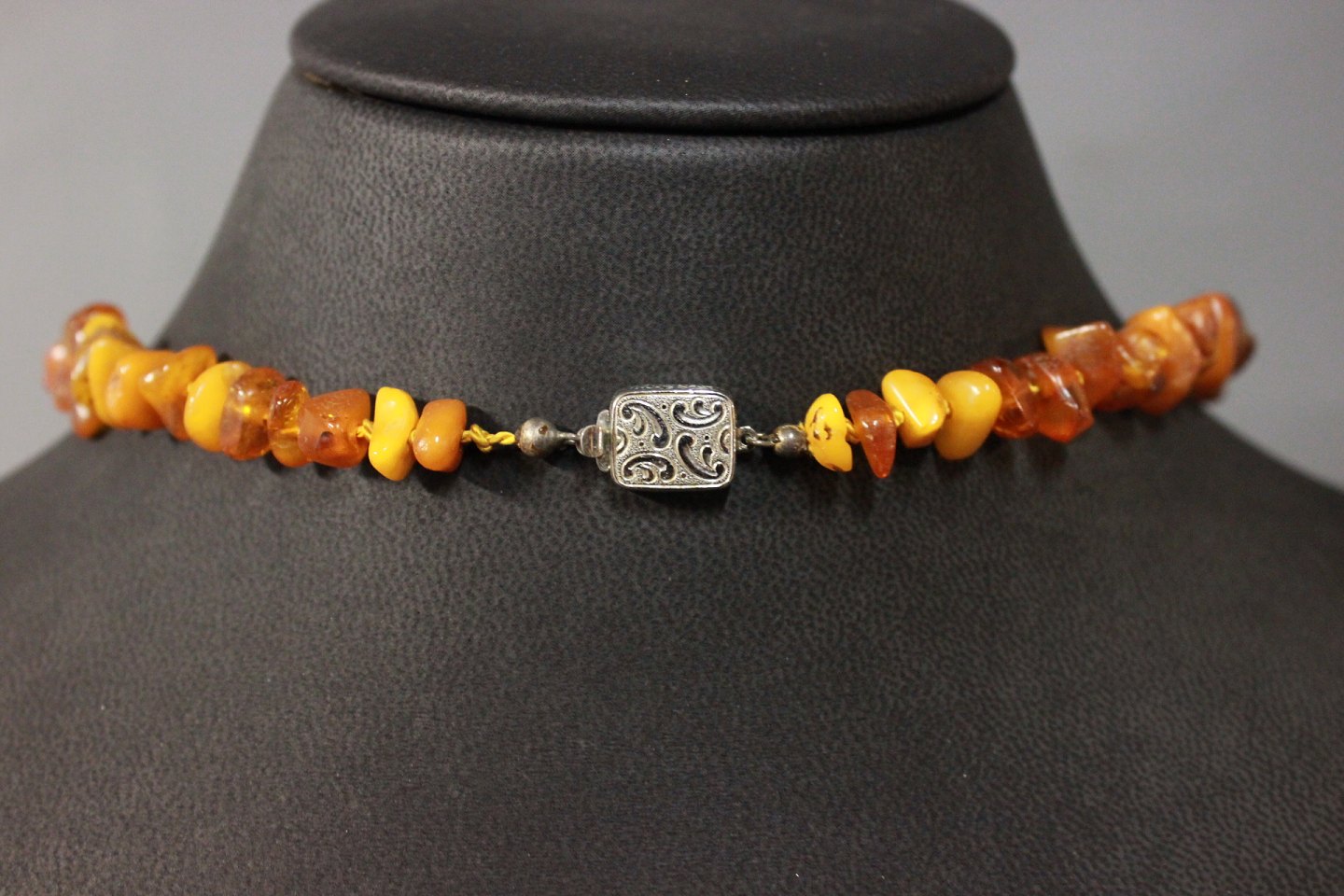 Long necklace of large amber pieces and delicate silver Lock, 830s.