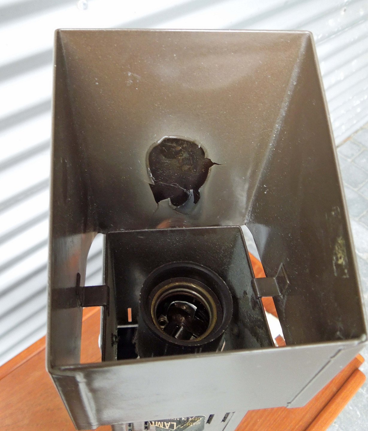 Brugsspor ved fod. Brændt hul på indersiden af skærm.