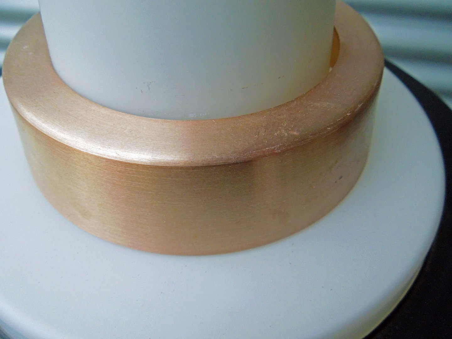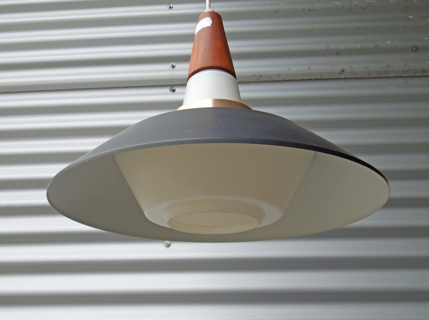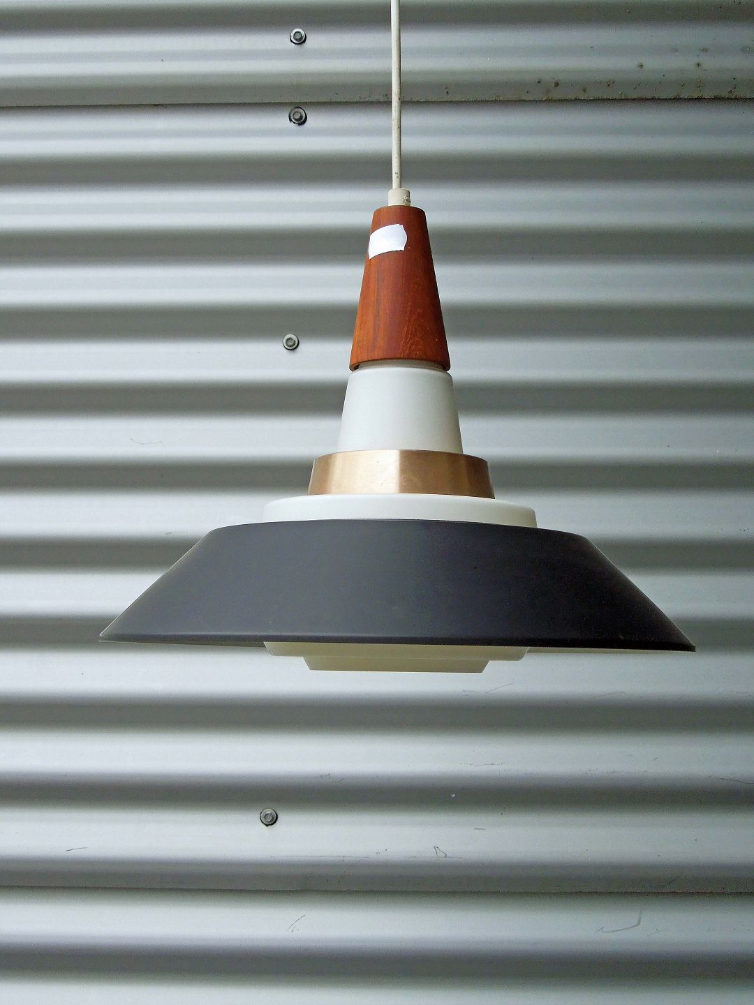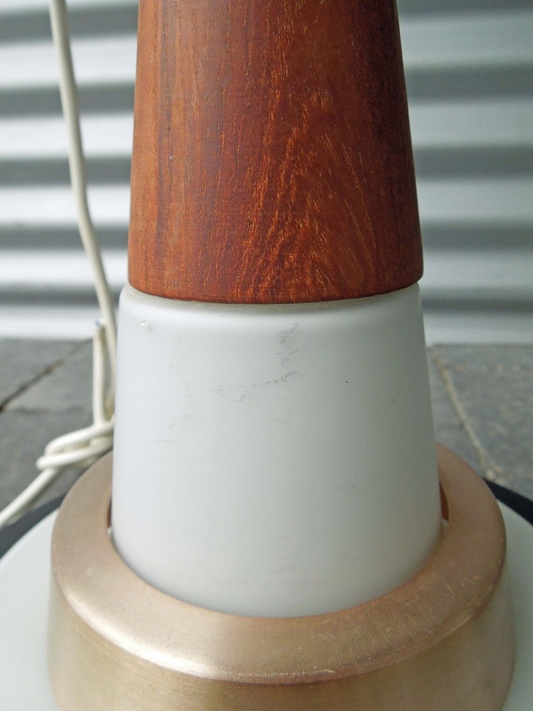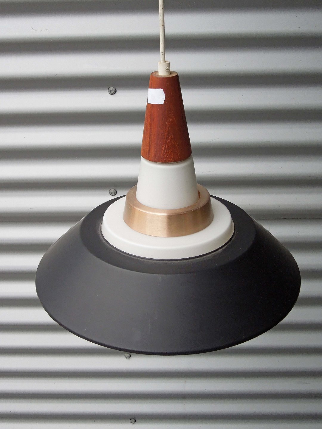 Loftslampe pendel i kobber, sortlakeret metal, hvidt opal glas og teak i toppen. Brugsspor ved træ og hvidt glas.