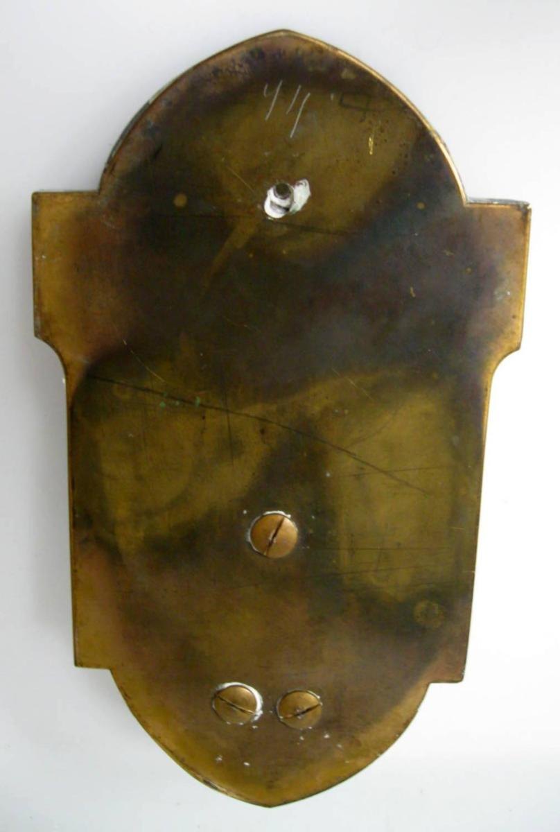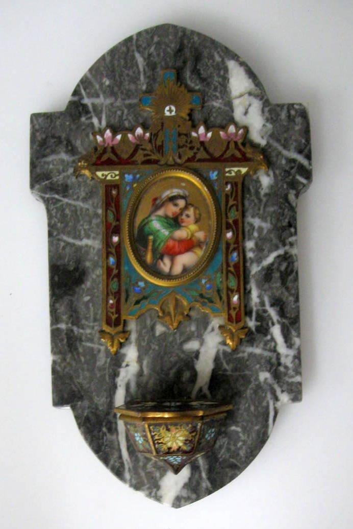 Vievandskar af bronze, prydet med cloisonnèarbejde, 19. årh. Dekoreret med kalk, kors og andre religiøse symboler. Plaquette i midten med "Madonna og barnet", bemalet porcelæn. Monteret på gråbroget marmor. Bastykke i messing. H.: 21 cm. B.: 12 cm.