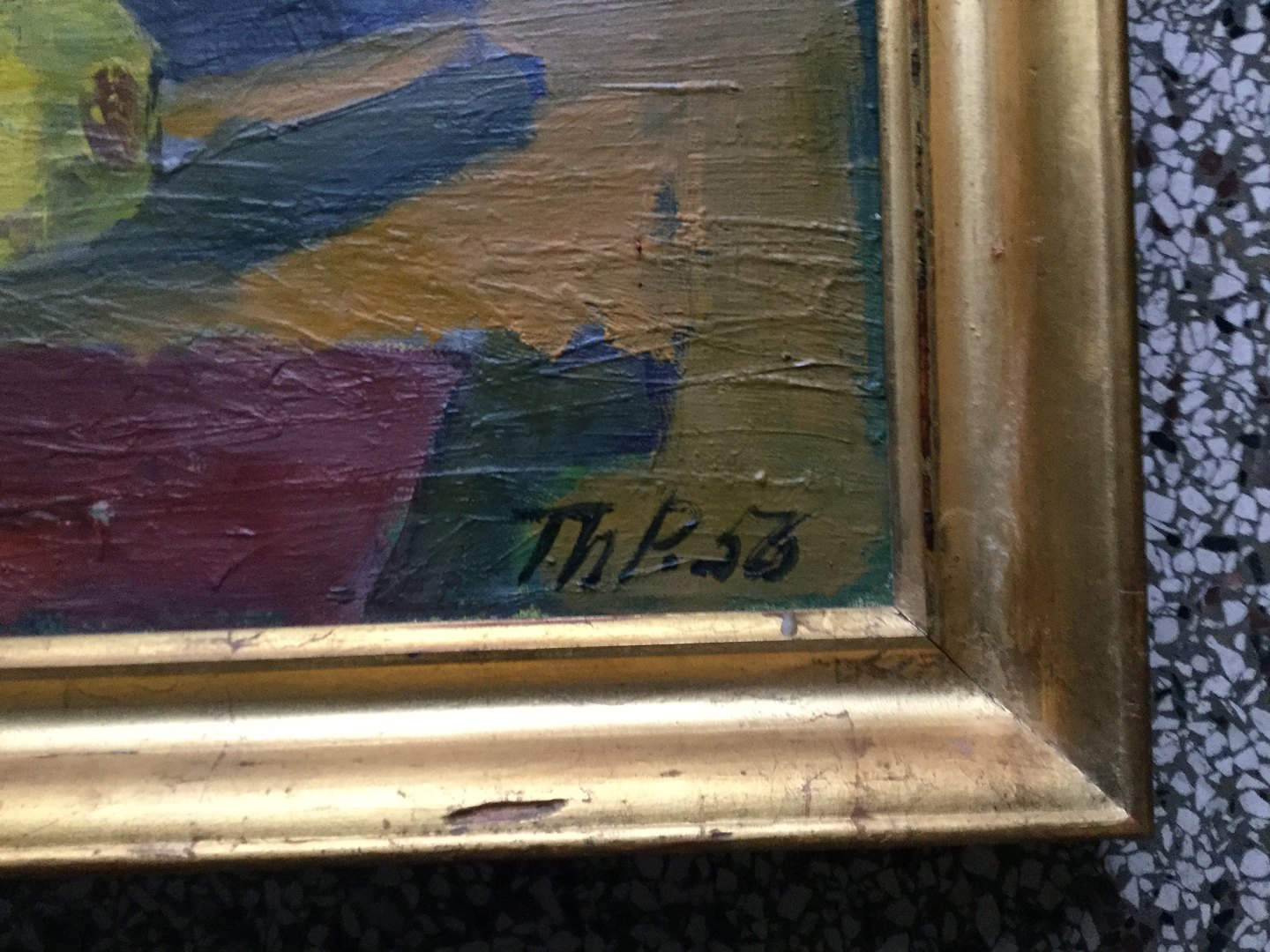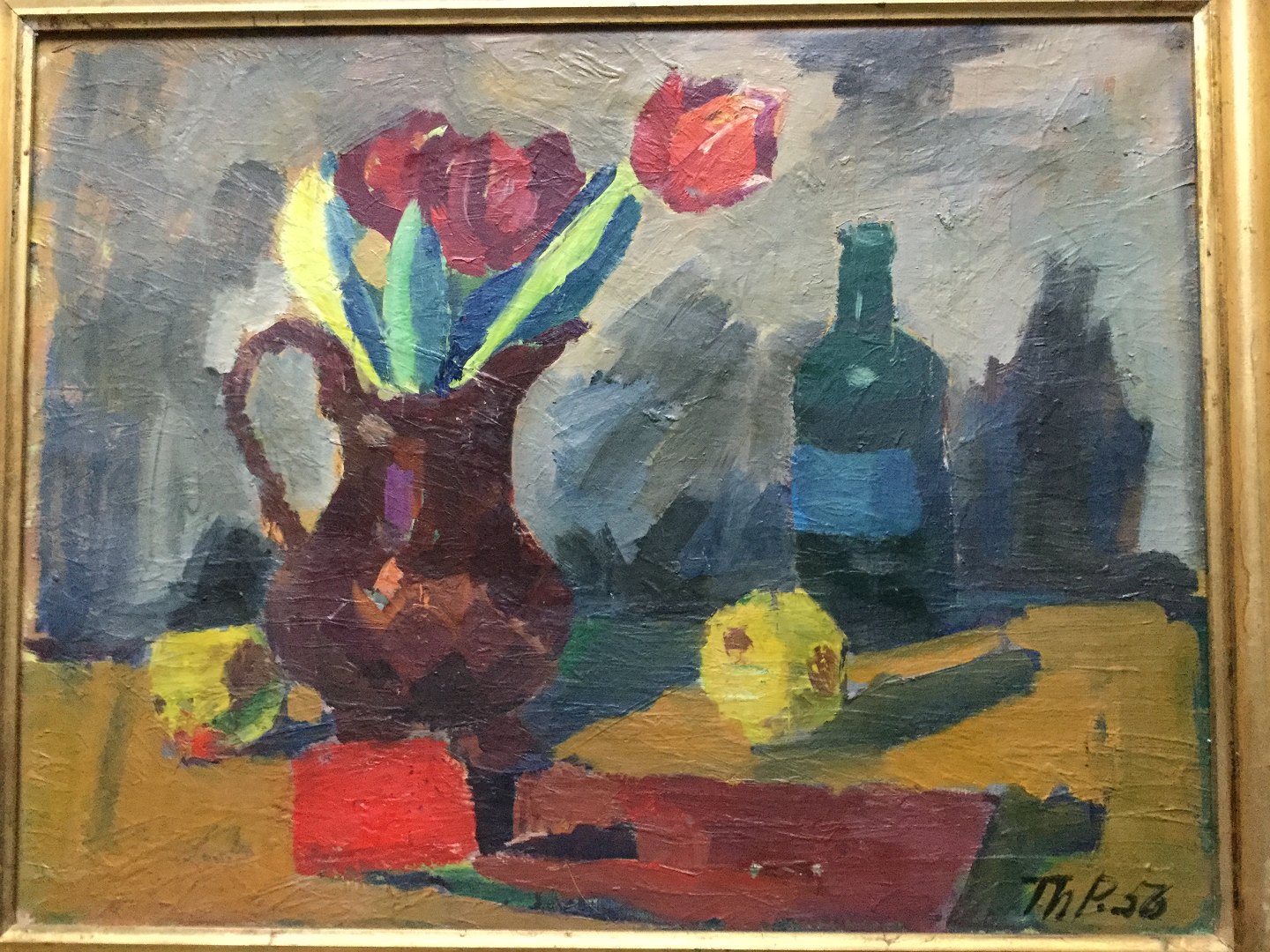 Text available in Danish: Maleri af Thorvald Petersen 1956 - Kande med tulipaner, flaske og frugt på bord.