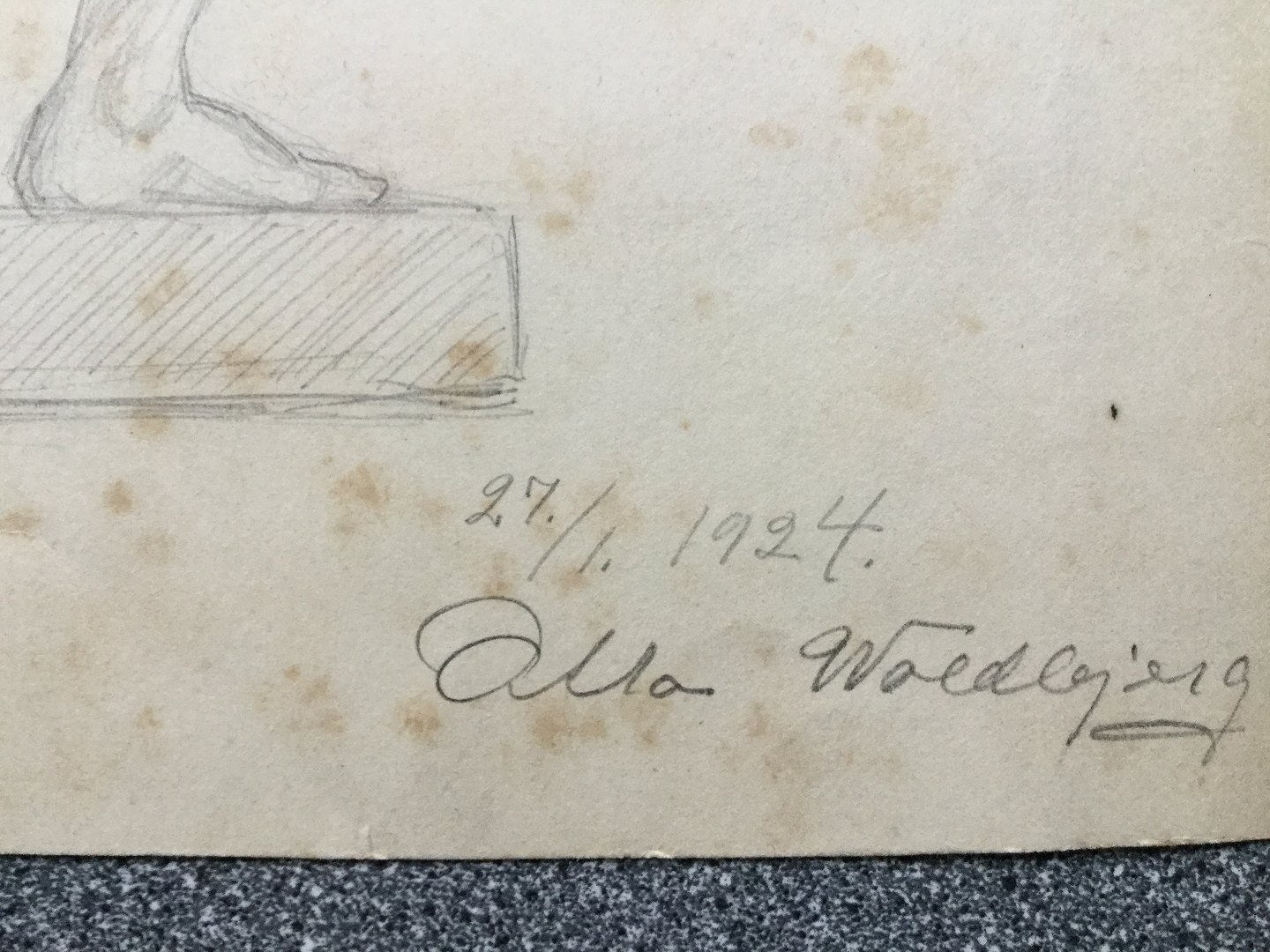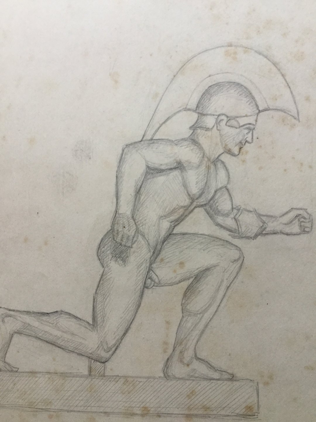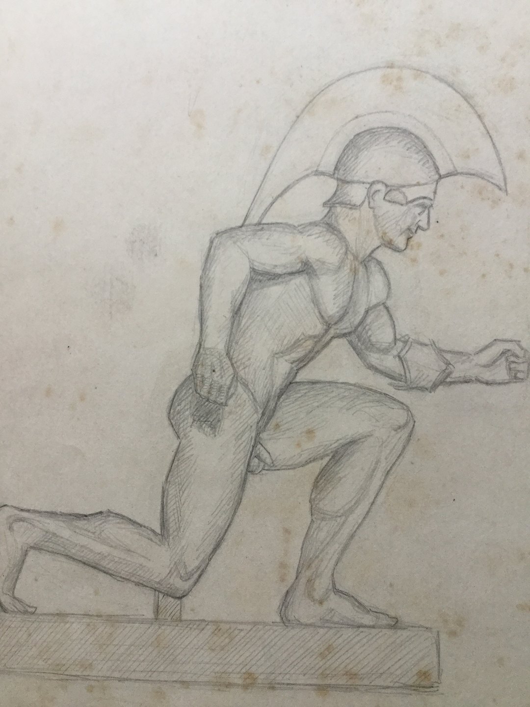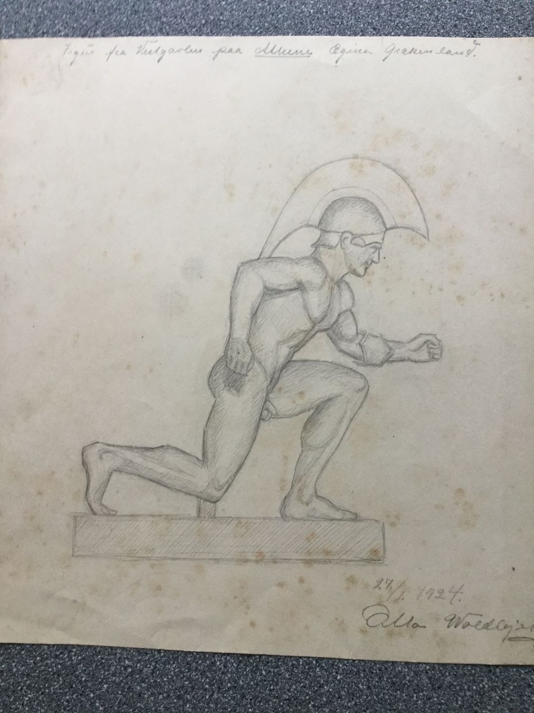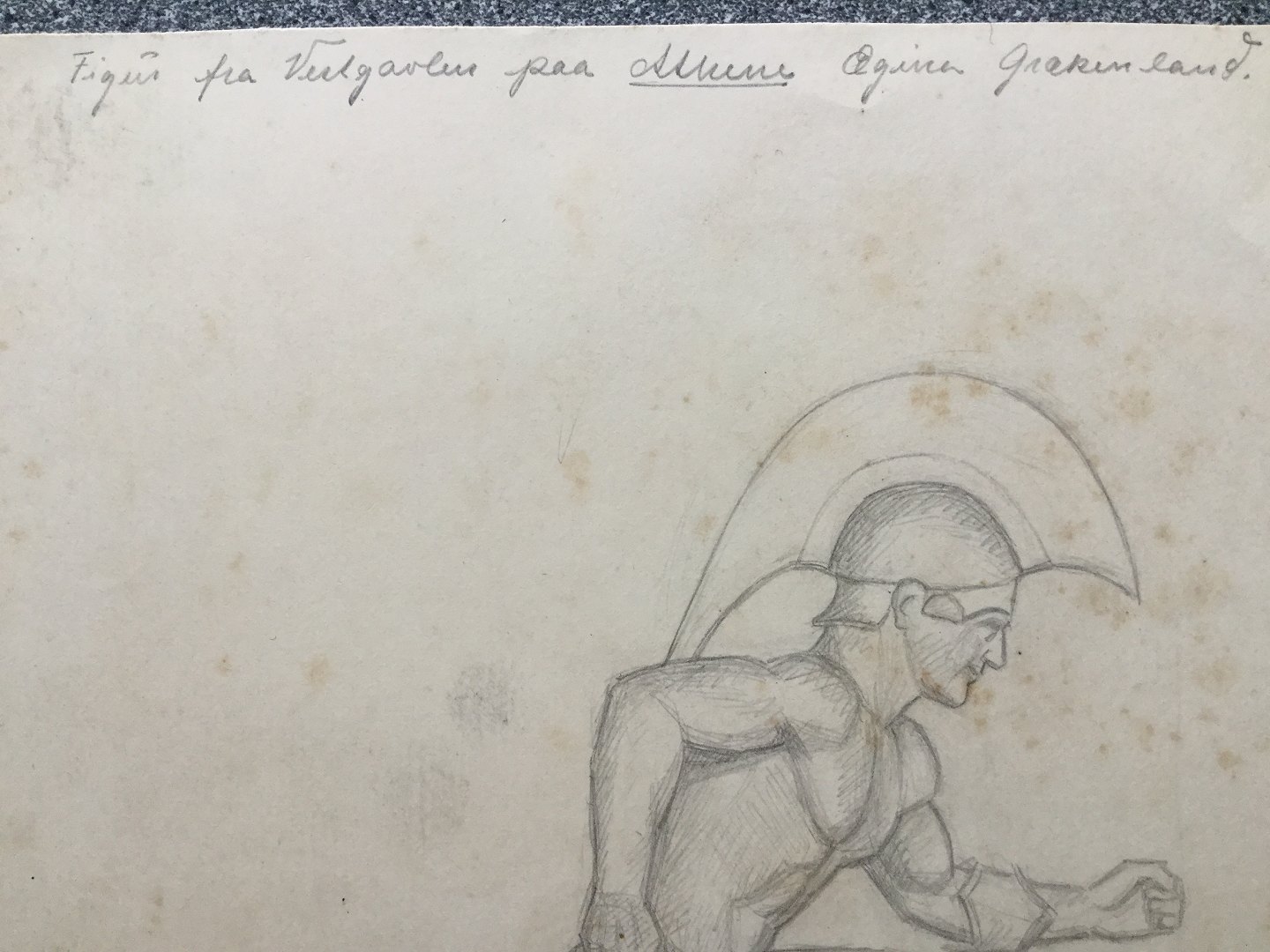 Tegning af Otto Woldbjerg Nielsen - Figur fra bygningsværket Athene Ægina i Grækenland 1924.