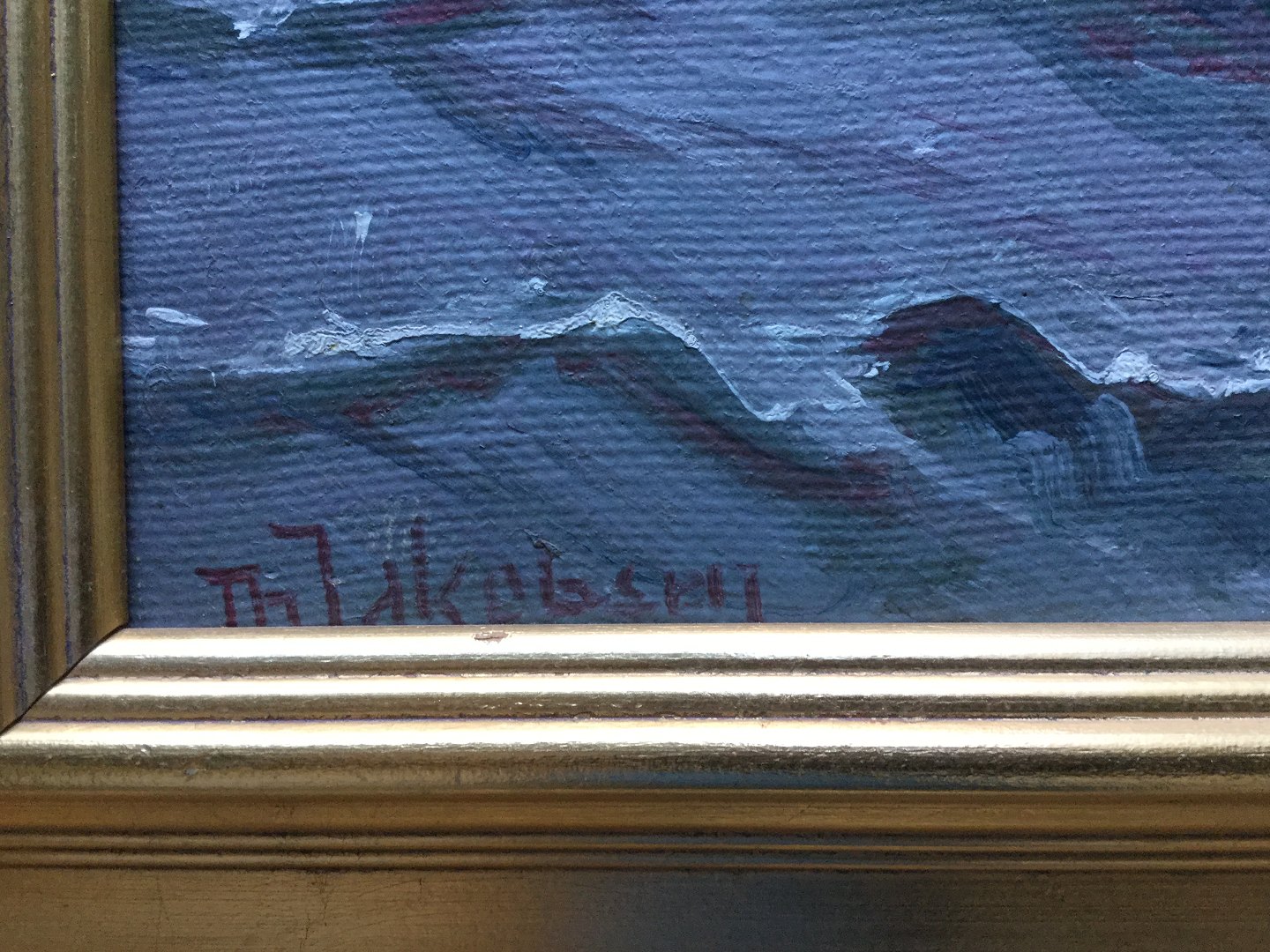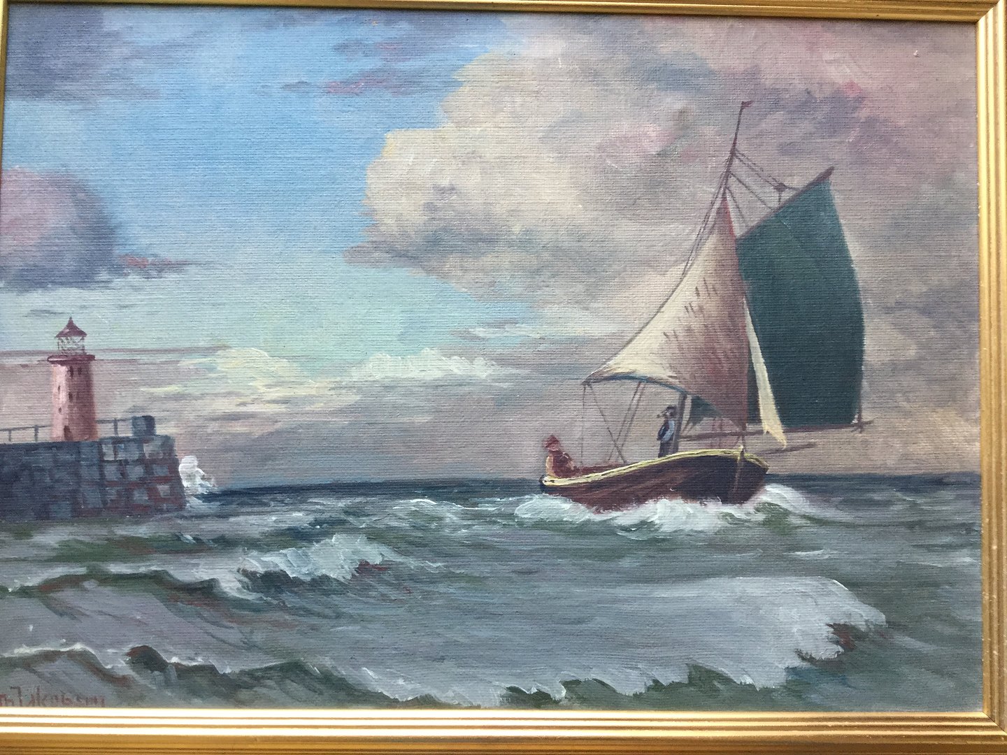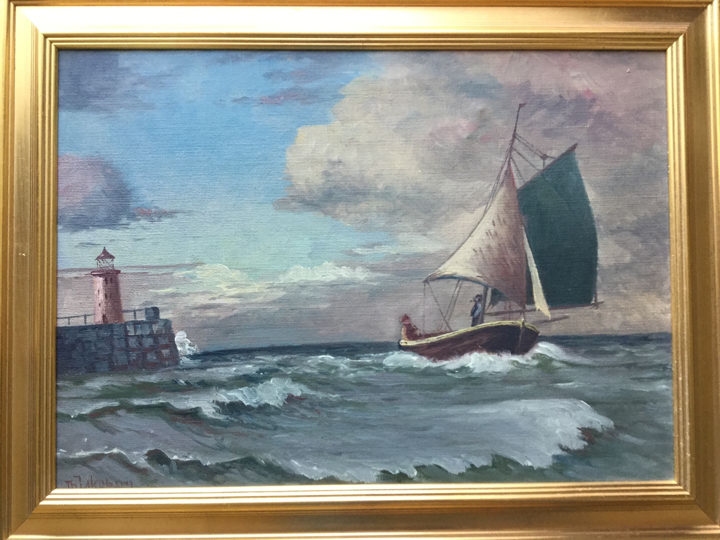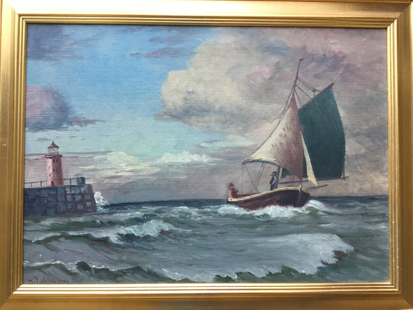 Maleri af Th. Jakobsen - Sejlskib ved indsejlingen til havn.