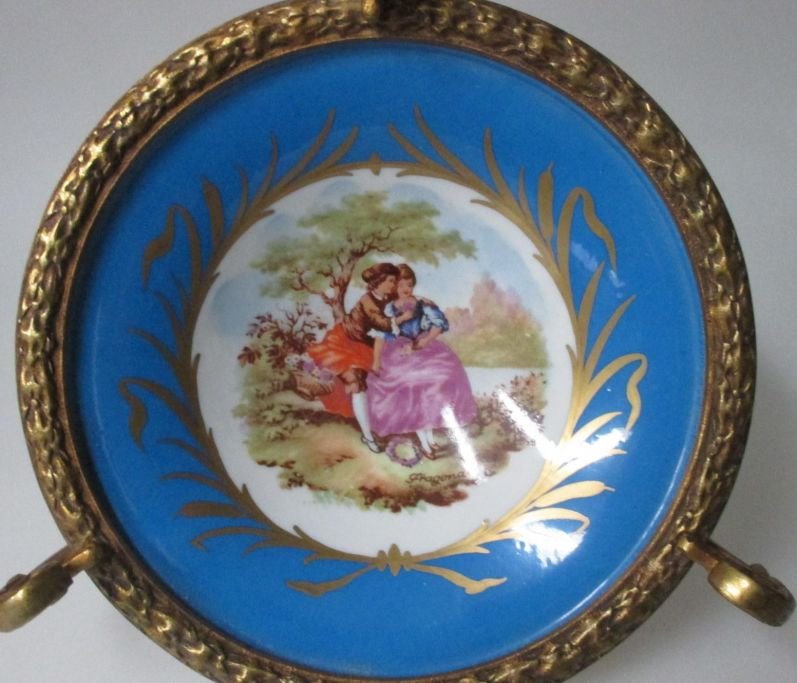 Tassa i lue forgyldt bronze med porcelæns skål, 19/20. årh. Frankrig. Hvid porcelænsskål med rococo hyrde scene i transfer teknik og håndmalet blå kant med forgyldning. Tassa på tre ben og med tre hanke. Højde: 11 cm. Dia skål: 11 cm. Stemplet.