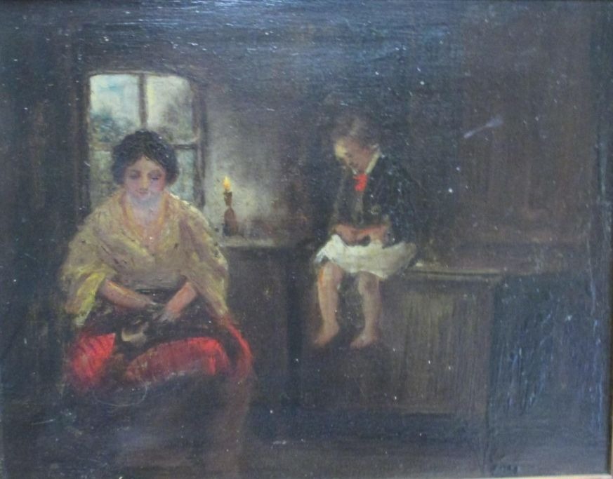 Engelsk kunstner (19. årh.): Køkken interiør med kvinde og dreng. Olie på træpanel. Usigneret. 25,5 x 30 cm.