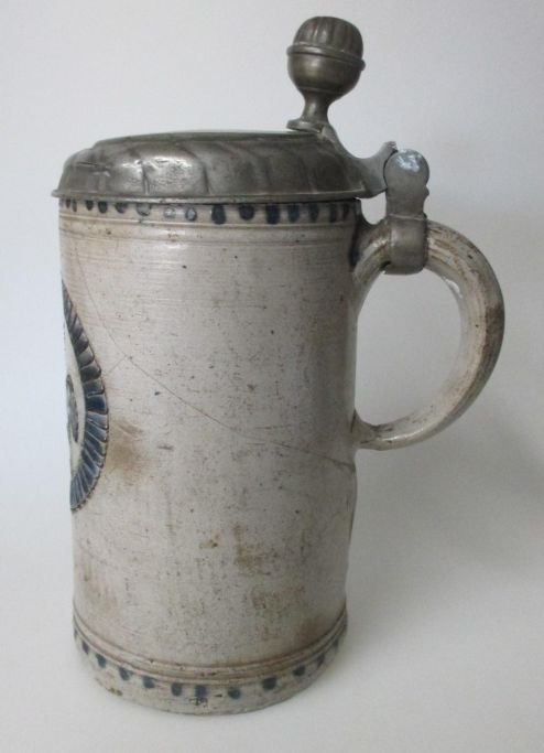 Tysk øl krus i grå saltglasur med tinlåg, 18. årh.