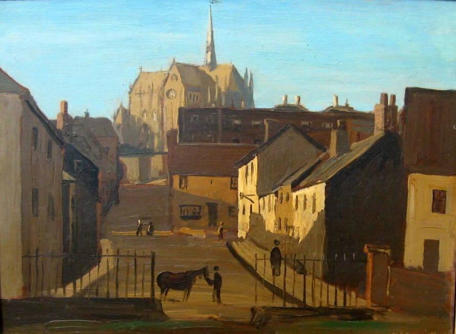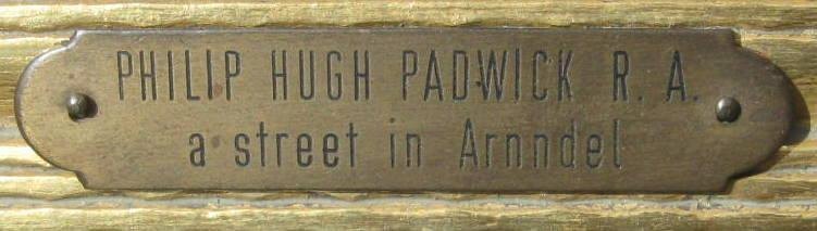 Padwick, Philip Hugh (1876 - 1958) England: View of Arundel, England, with the Cathedral and people on the streets. Oil on wood. Signed: Padwick. 33 x 42 cm. On the back label titled: Street Scene, Arundel. In a gilt frame.