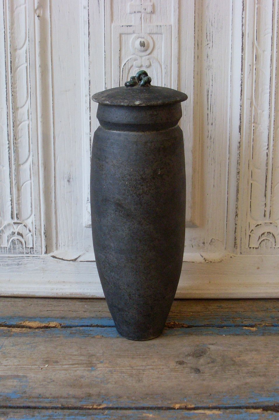Æstetisk smuk slank låg vase med ornamental dekoration på lågets top.