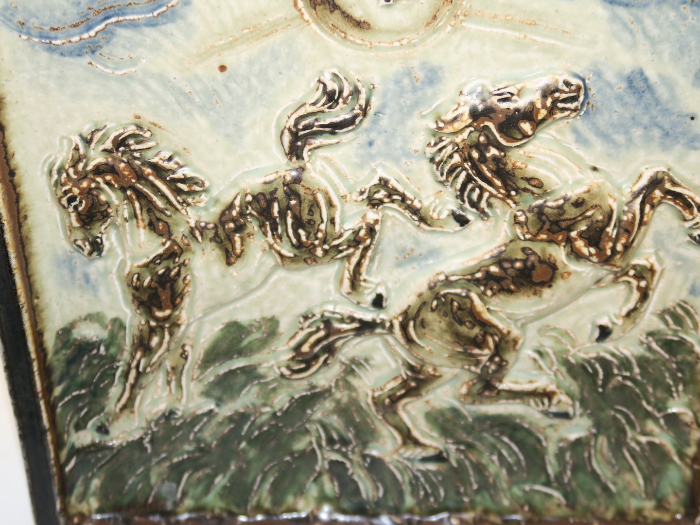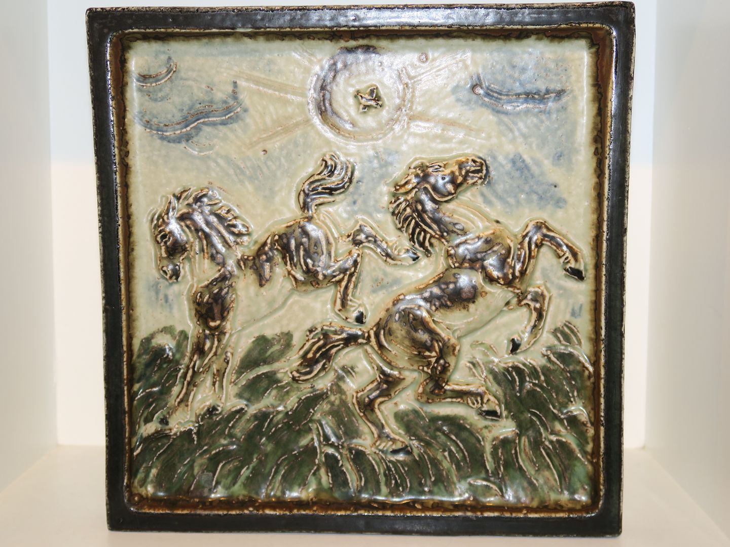 Royal Copenhagen stort stentøjsrelief med to springende heste i solen.