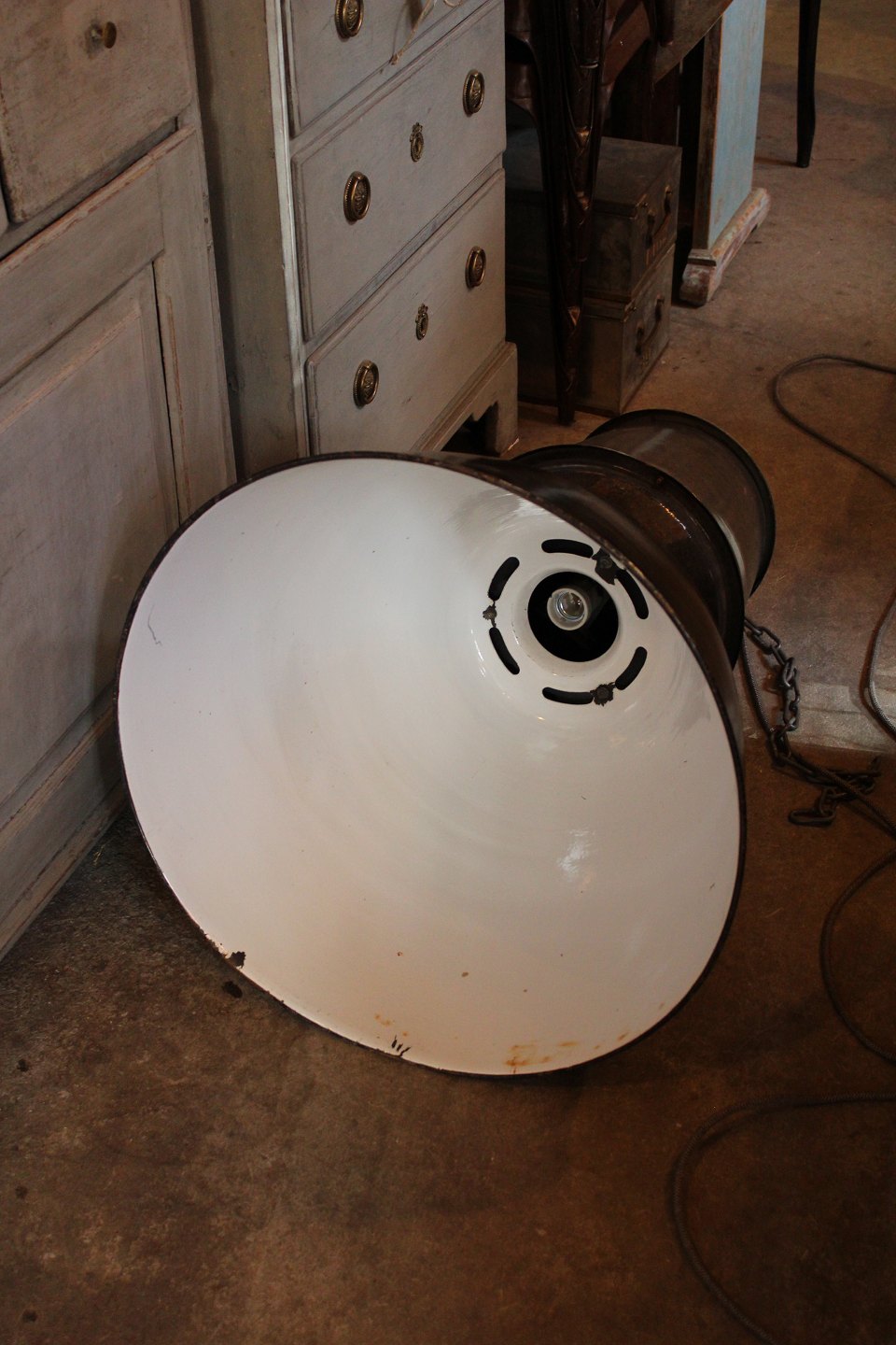 Gammel Franske industri lampe fra 50érne i metal med koksgrå / sort emalje på ydersiden / hvid inden i.