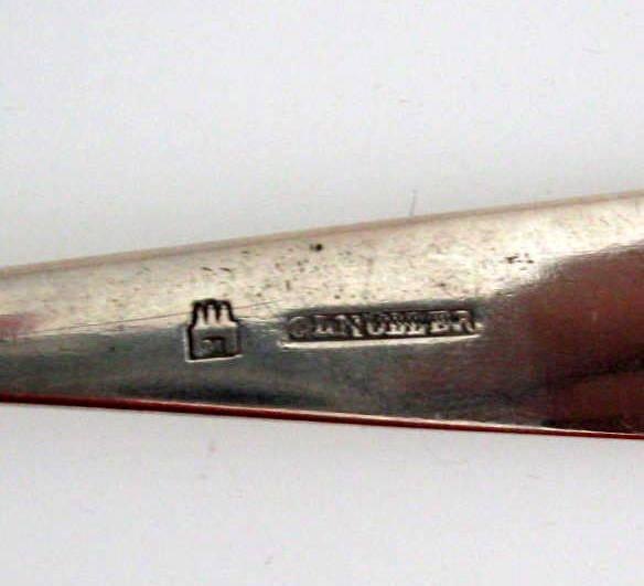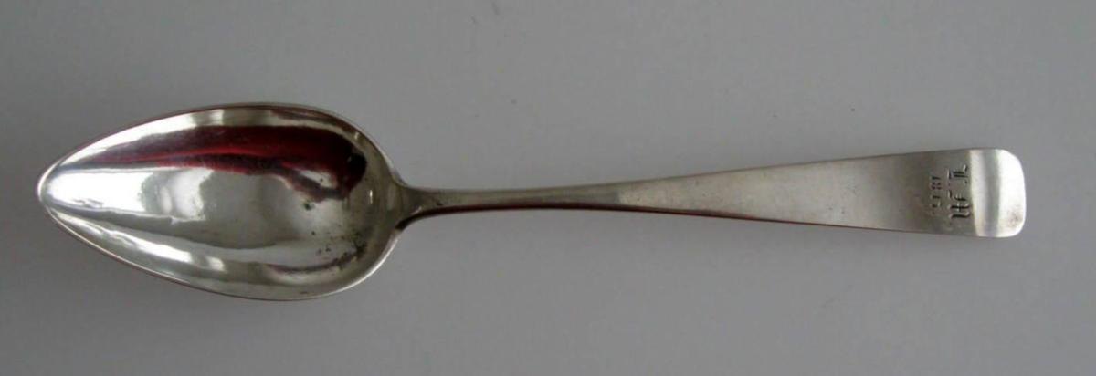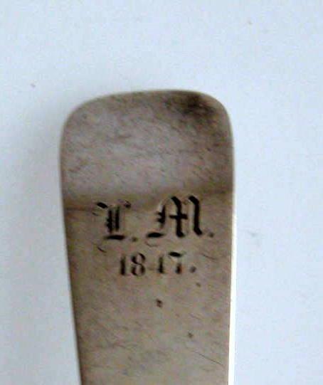 Sølv ske fra Hamborg, stemplet med Hamborgs segl og M. Mester.: C. L. Müller og bølgemærket henover mesterstemplet. På forsiden graveret.: L. M. 1847. Længde.: 22,5 cm.  Med forgyldt laf.