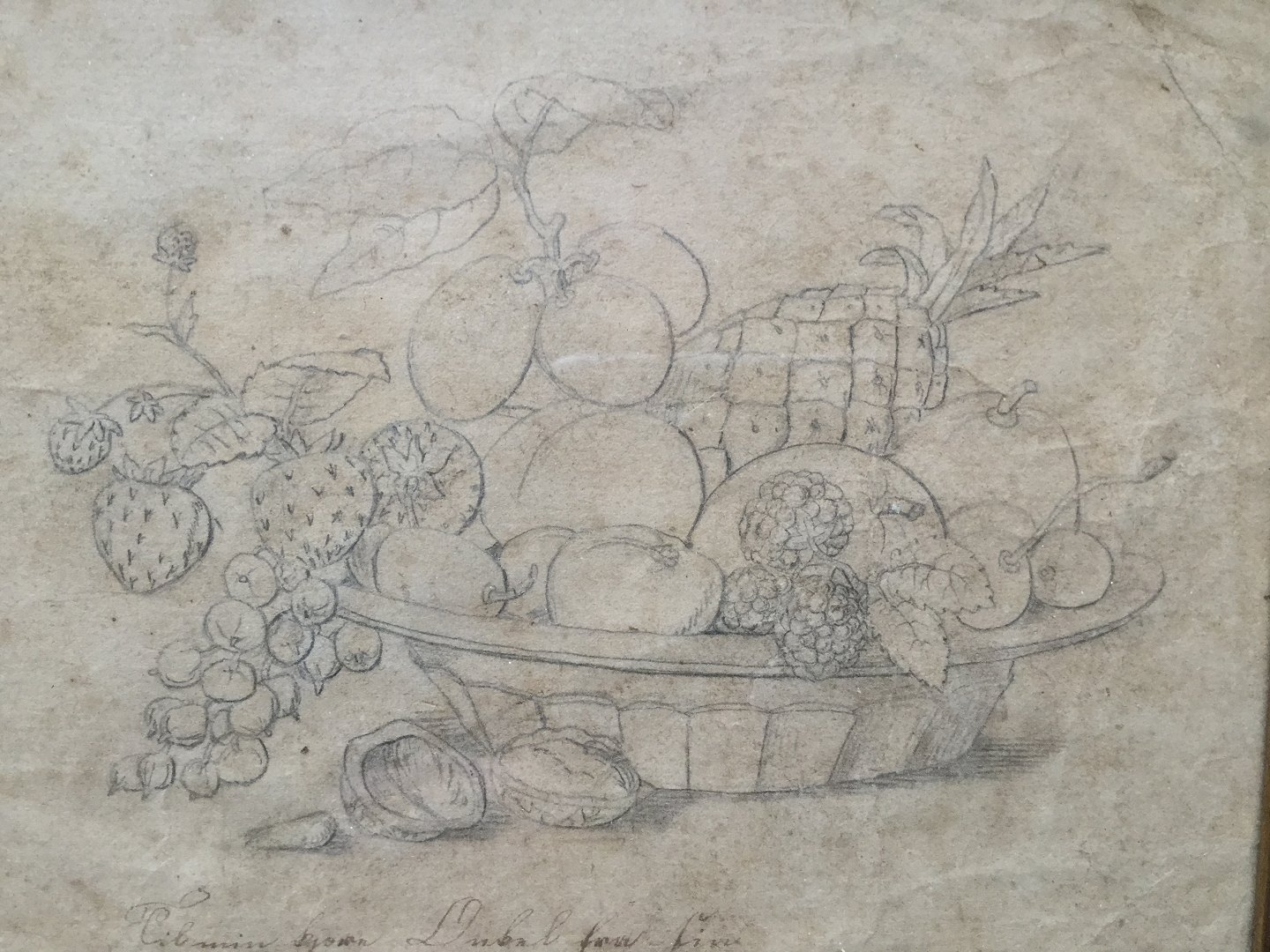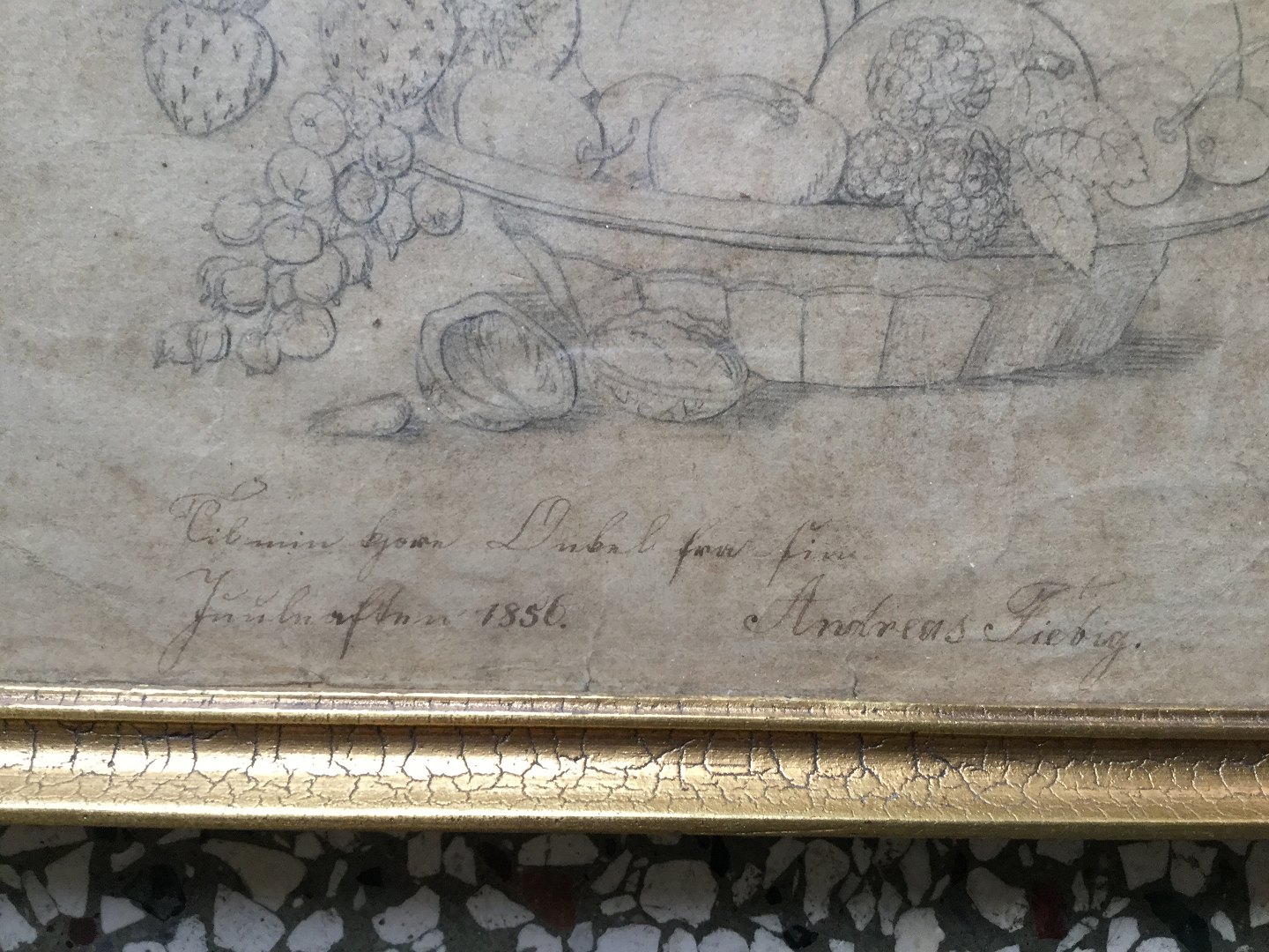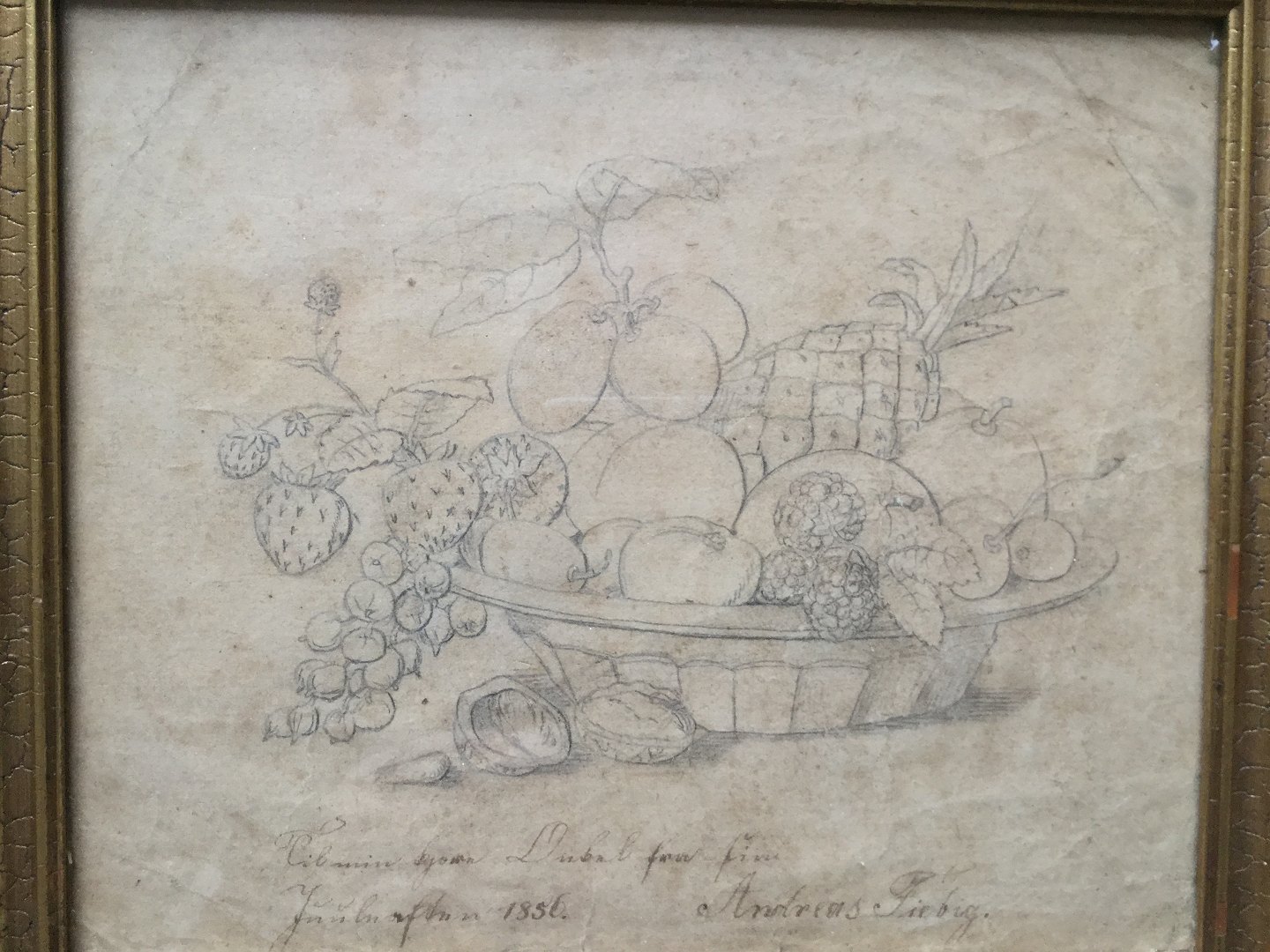 Tegning af Andreas Fiebig 1856 - Skål med frugt og nødder.