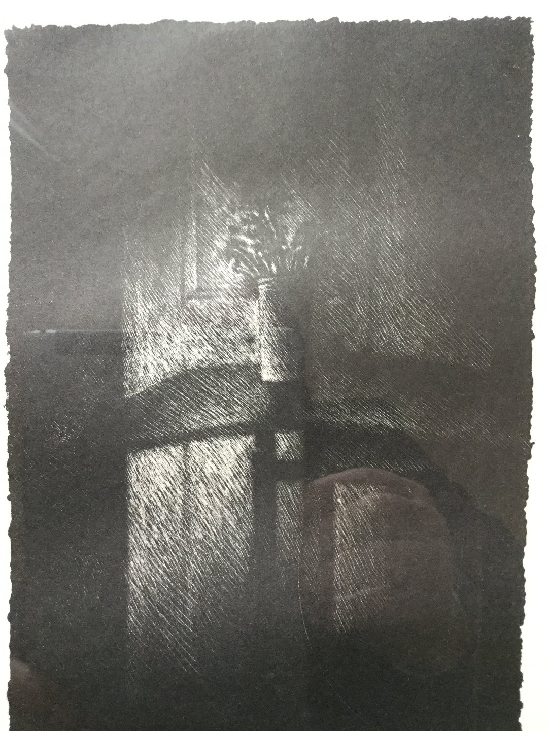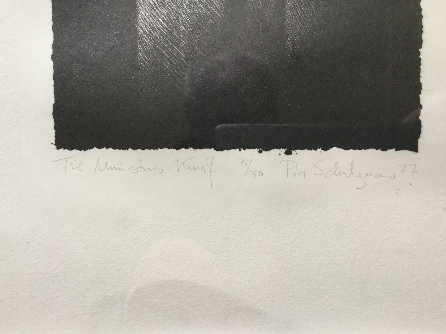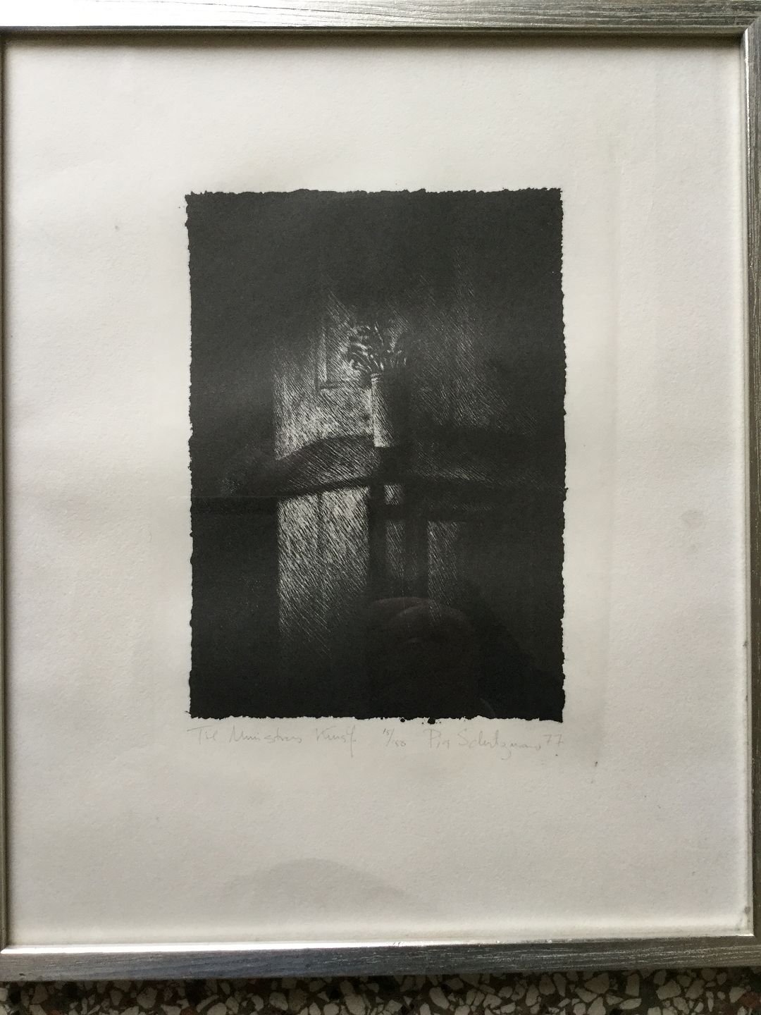 Litografi af Pia Schutzmann - Vase på bord 1977.