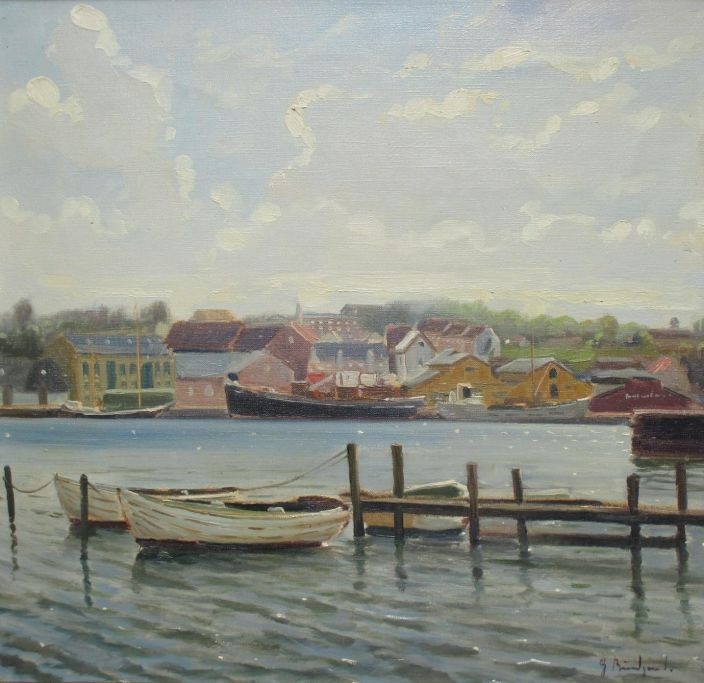 Bundgaard, Gunnar (1920 - 2005) Danmark: Parti fra havnen i Hobro. Olie på lærred. Signeret: G. Bundgaard. 50 x 53 cm.