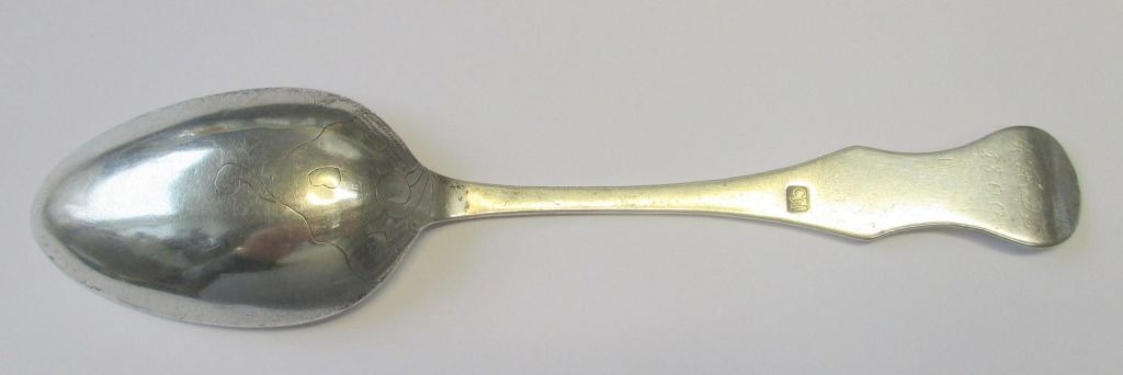 Sølvske, mester Claus Hestorff (ca. 1774 - 1833?) Tønder, Danmark. Violin mønster. Med rococo graveringer på laf. Stemplet: Cl H. Med indgravering: RJJSB - MJRS 1800. Senere indgravering: RIR. Længde: 19,3 cm. Vægt.: 39 gram.