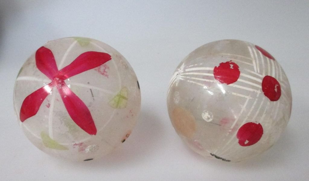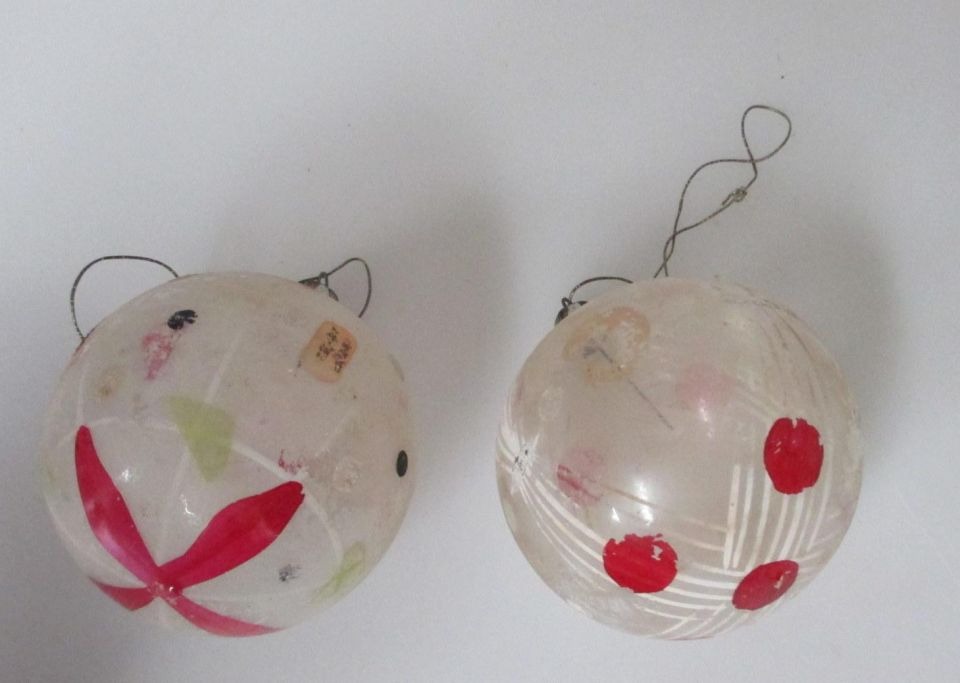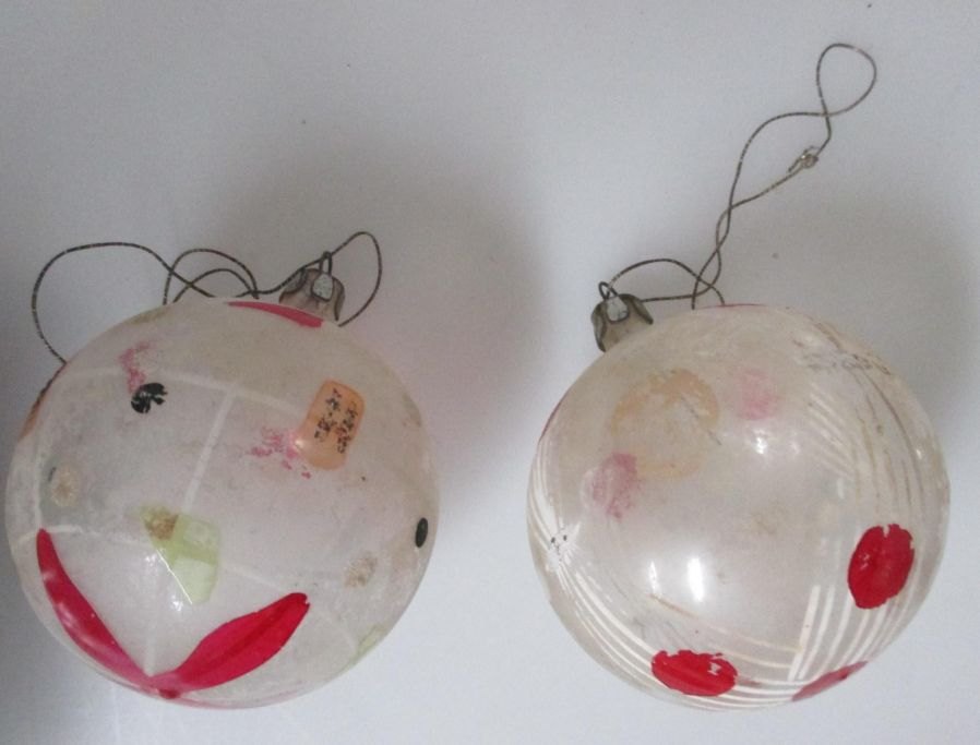Jule træs dekoration, 1920-30, Tyskland. Emaljebemalede jule kugler med art deco dekorationer. Dia.: 6,5 cm.
