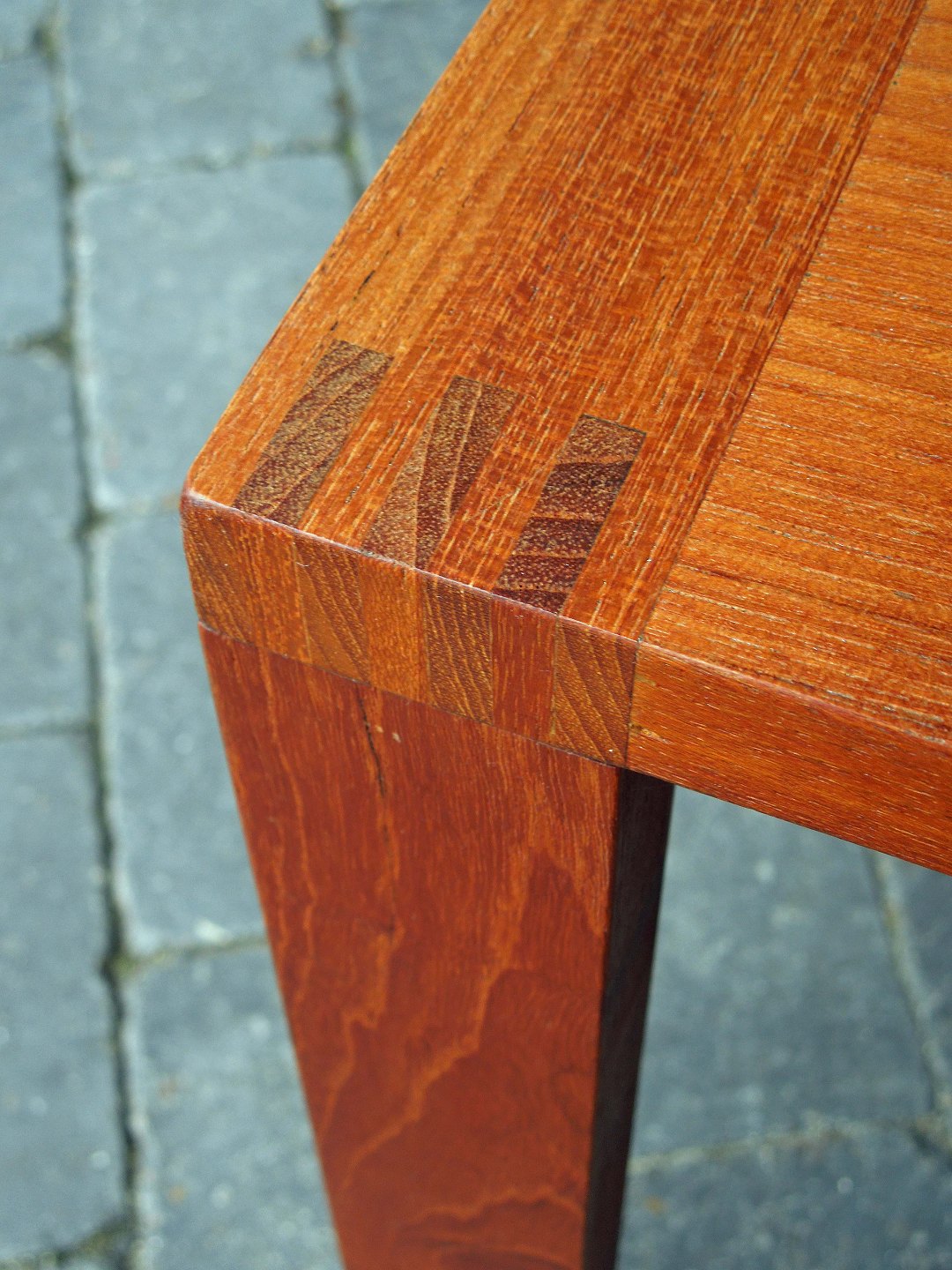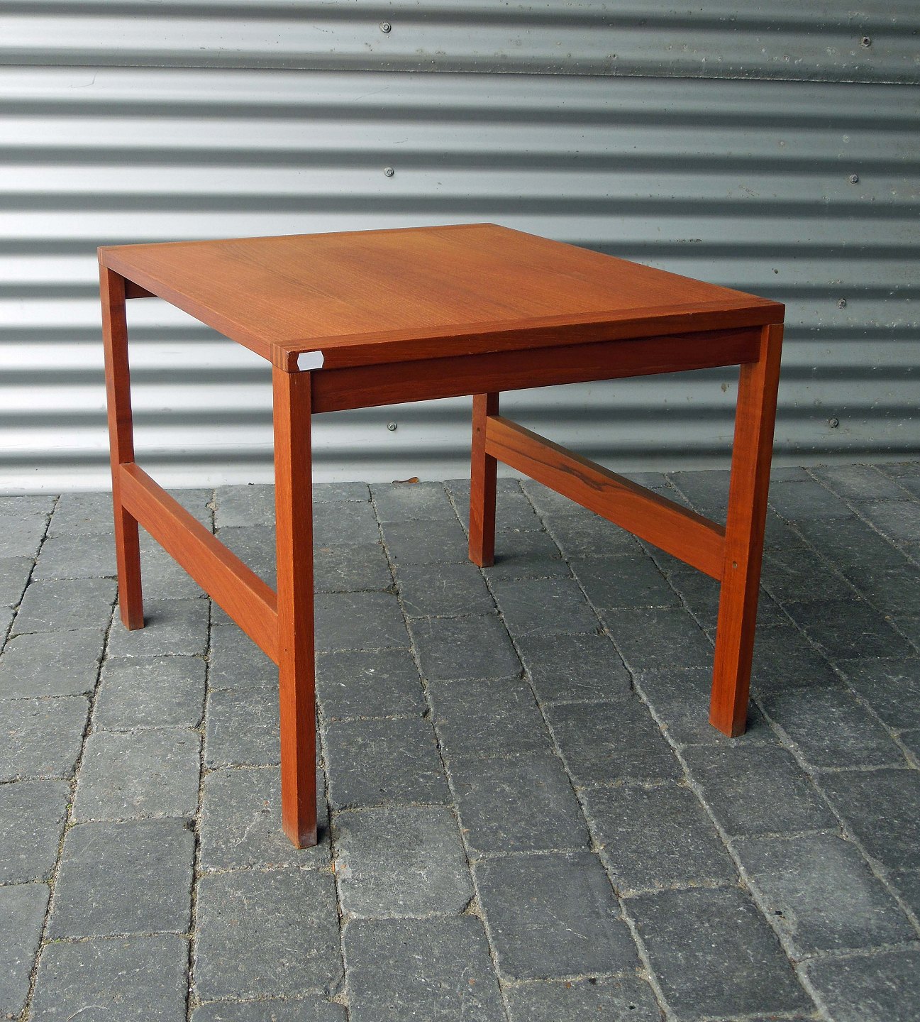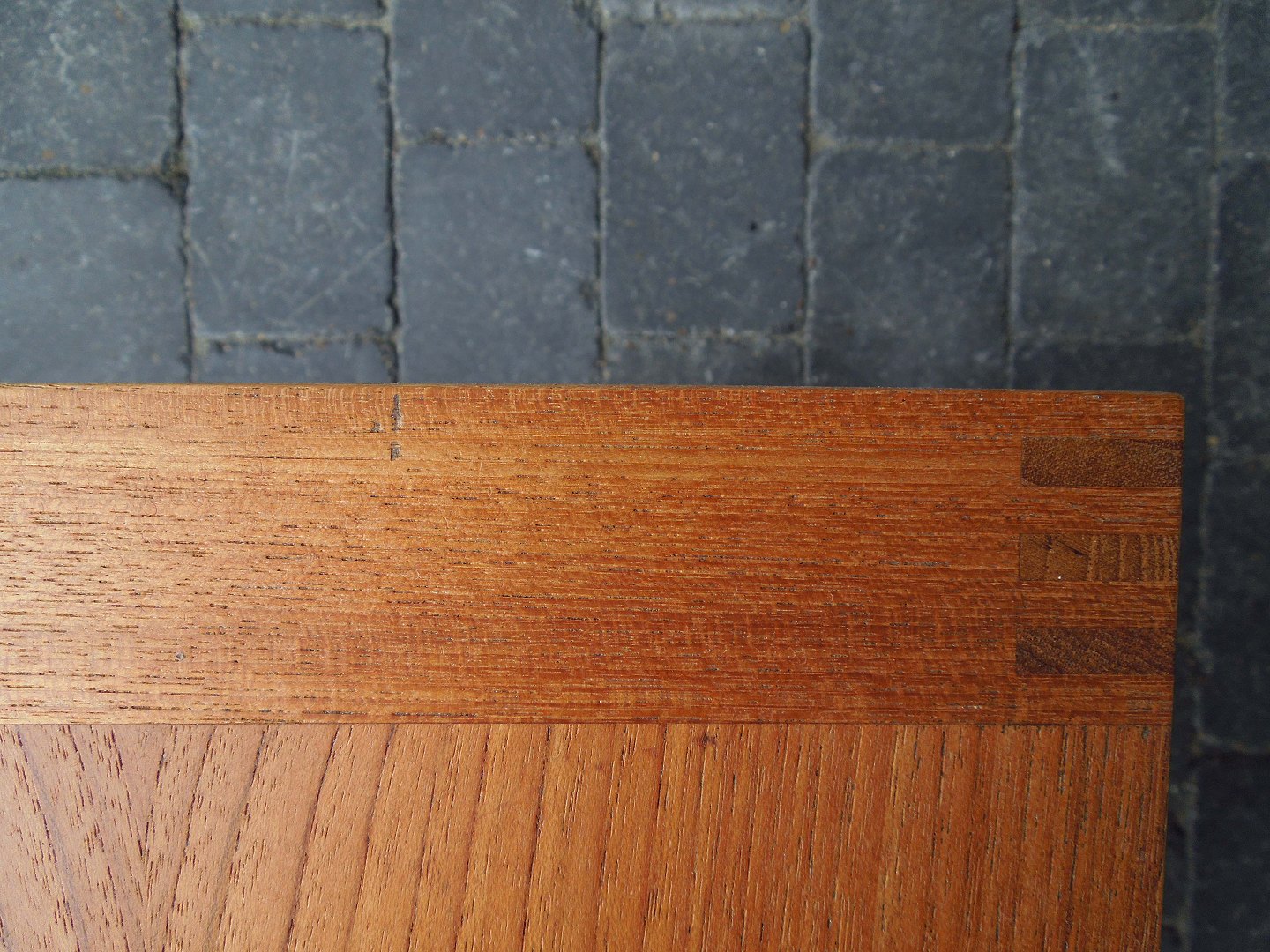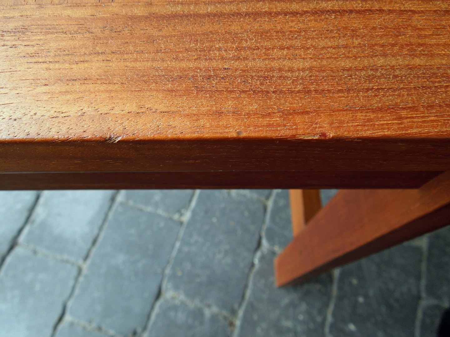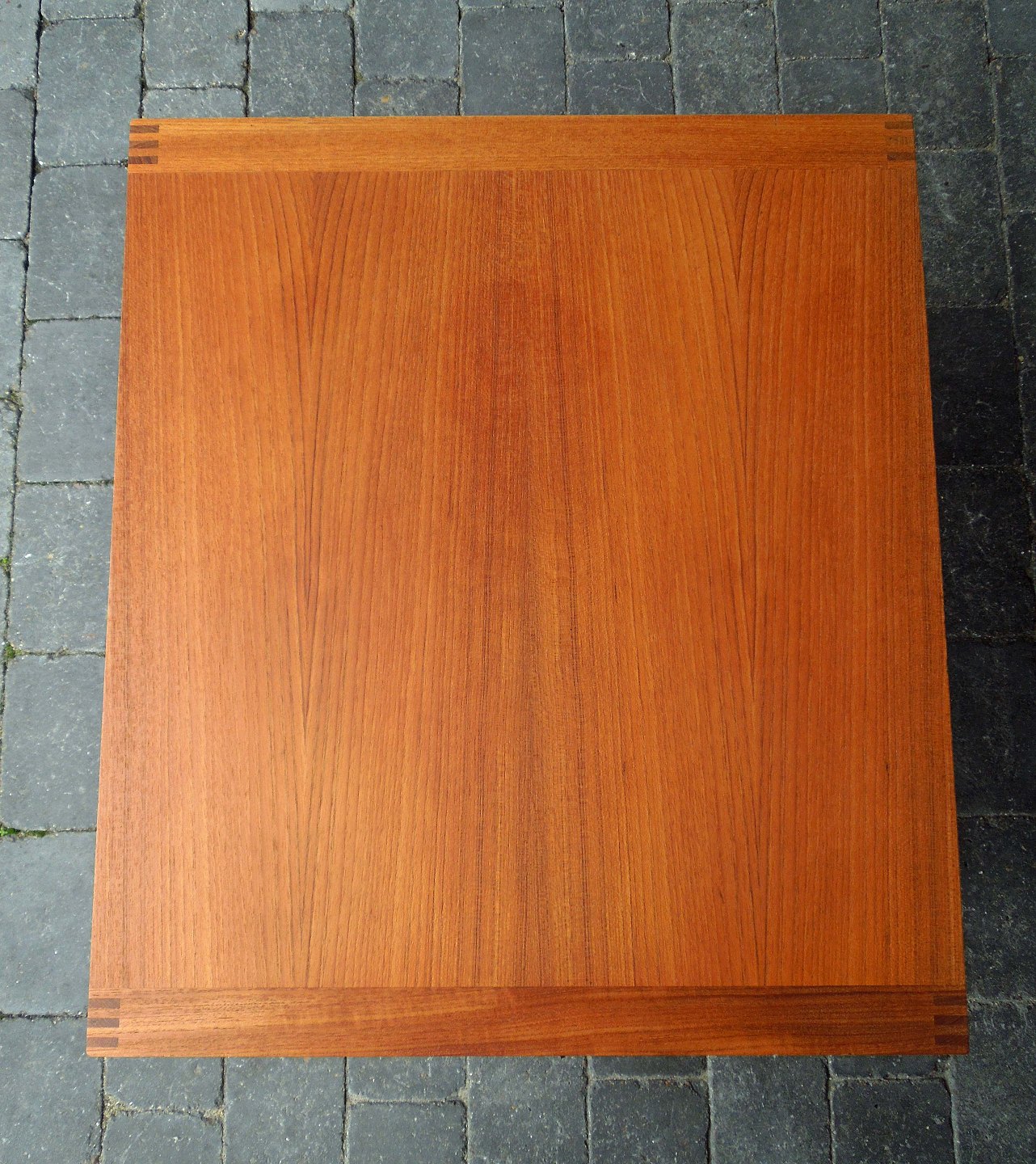 Teak sofabord med fine detaljer. bordet fremstår med enkelte brugsspor og enkelte små nøk i træet.
