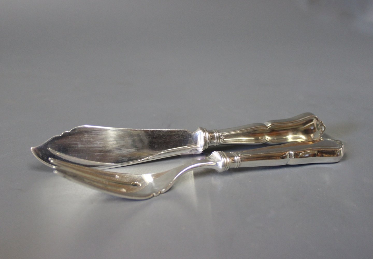 Fiskebestik bestående af kniv og gaffel i Rita, tretårnet sølv.
