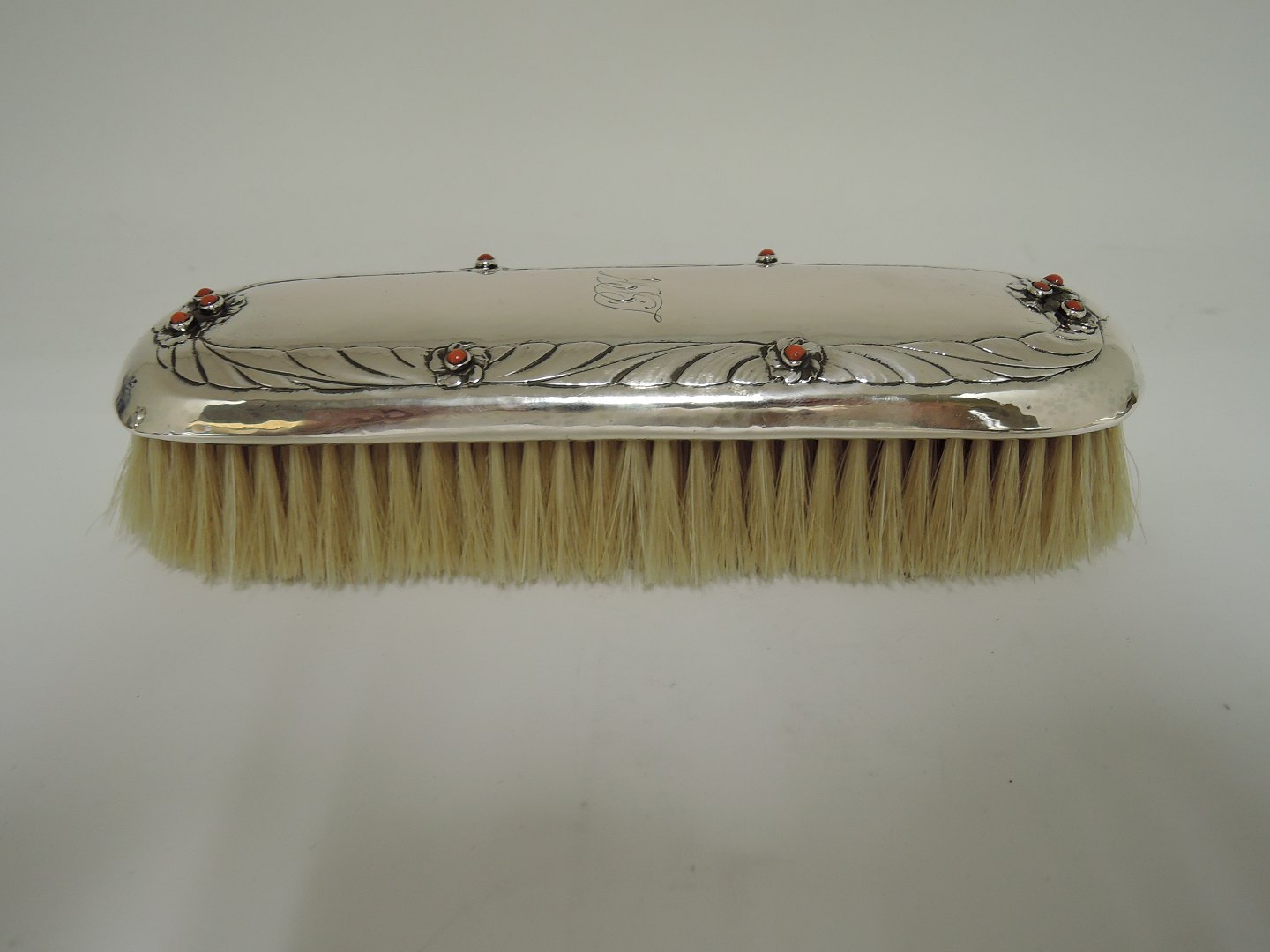 Evald Nielsen. Sølv (830). Toiletgarniture. 5 dele , bestående af spejl , 2 børster, bonbonniere samt til negle. Sættet er prydet med Koraller. Produceret 1925 - 1930.