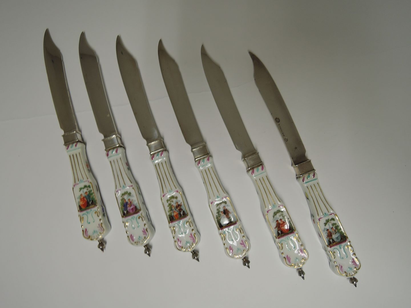 Aug. Thomsen. Sølv (830). 6 frugtknive med porcelænsskafter. Længde 20,5 cm. Produceret 1918