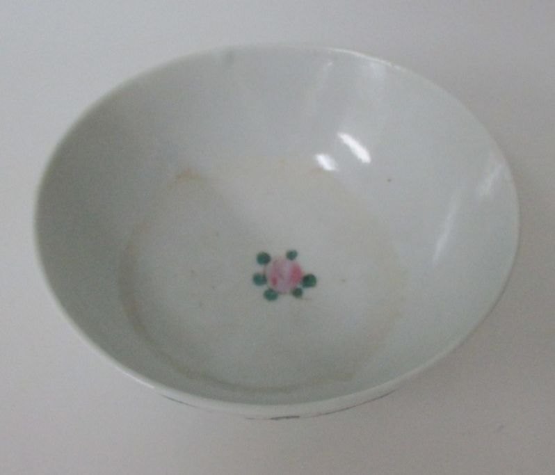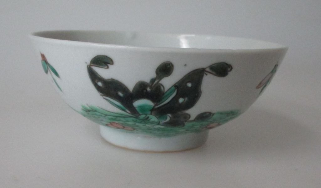 Antik Porcelænsskål på fod, Kina, famille verte, ca. 1860. Højde: 5 cm. Dia.: 12 cm. Polykrom dekoration med blomster og insekter. Stemplet.