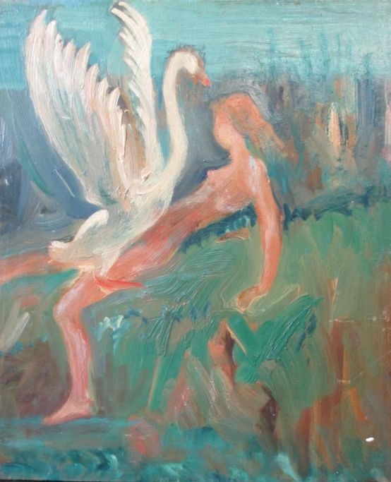 Testrup Jacobsen, Kristian Marius (1891 - 1975) Danmark: Leda med svanen. Olie på træ. 26 x 21,5 cm. Betegnet på bagsiden. På bagsiden label fra udstilling.