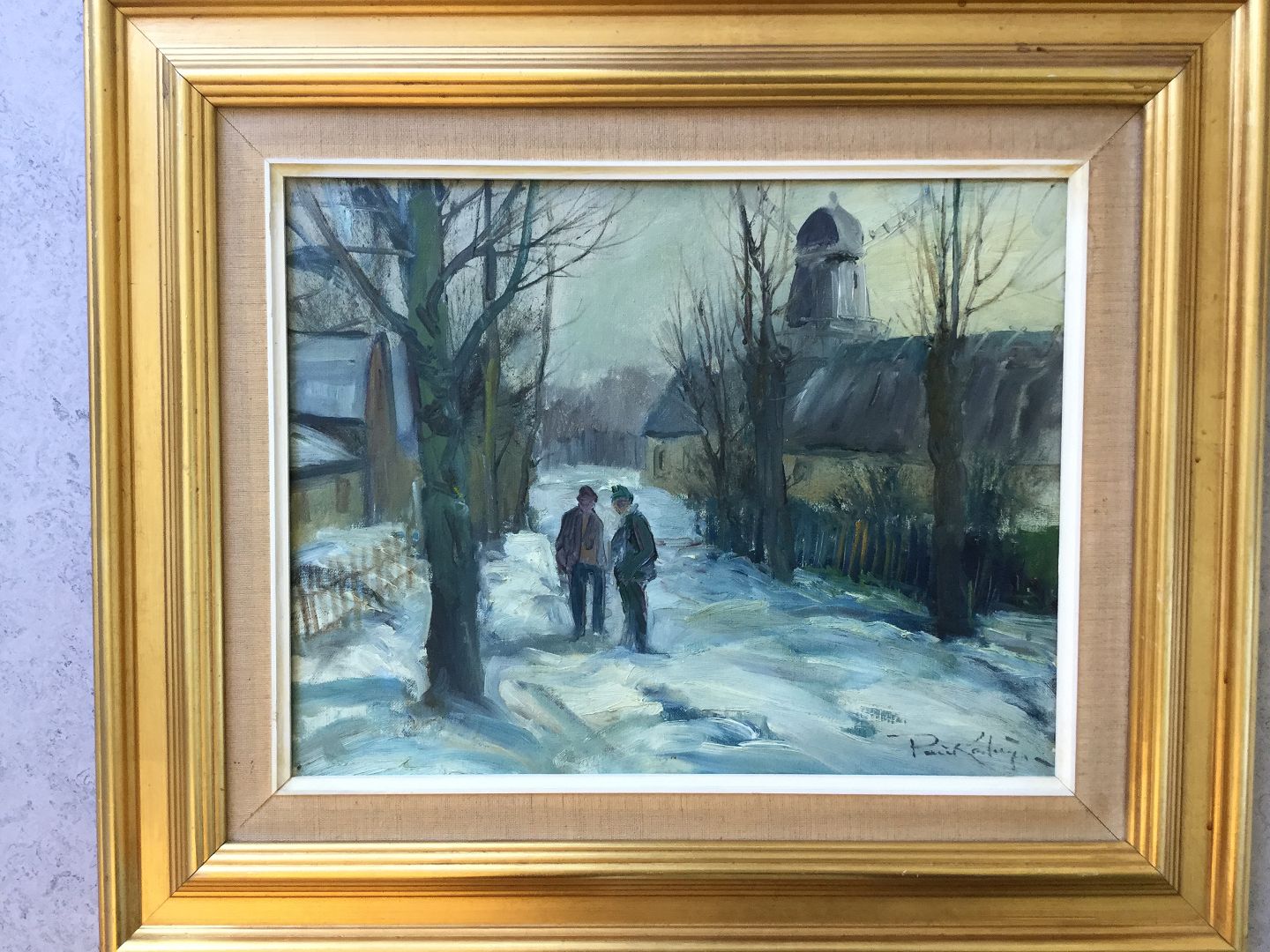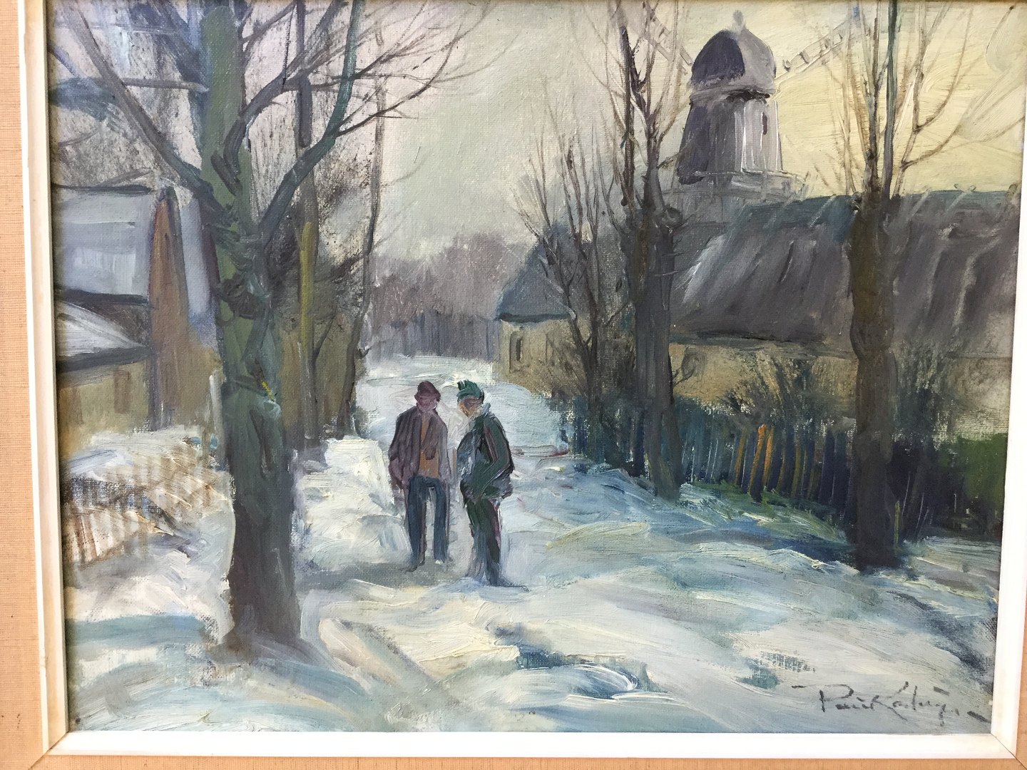Maleri af Poul Kastrup - Vinterparti med personer ved mølle.